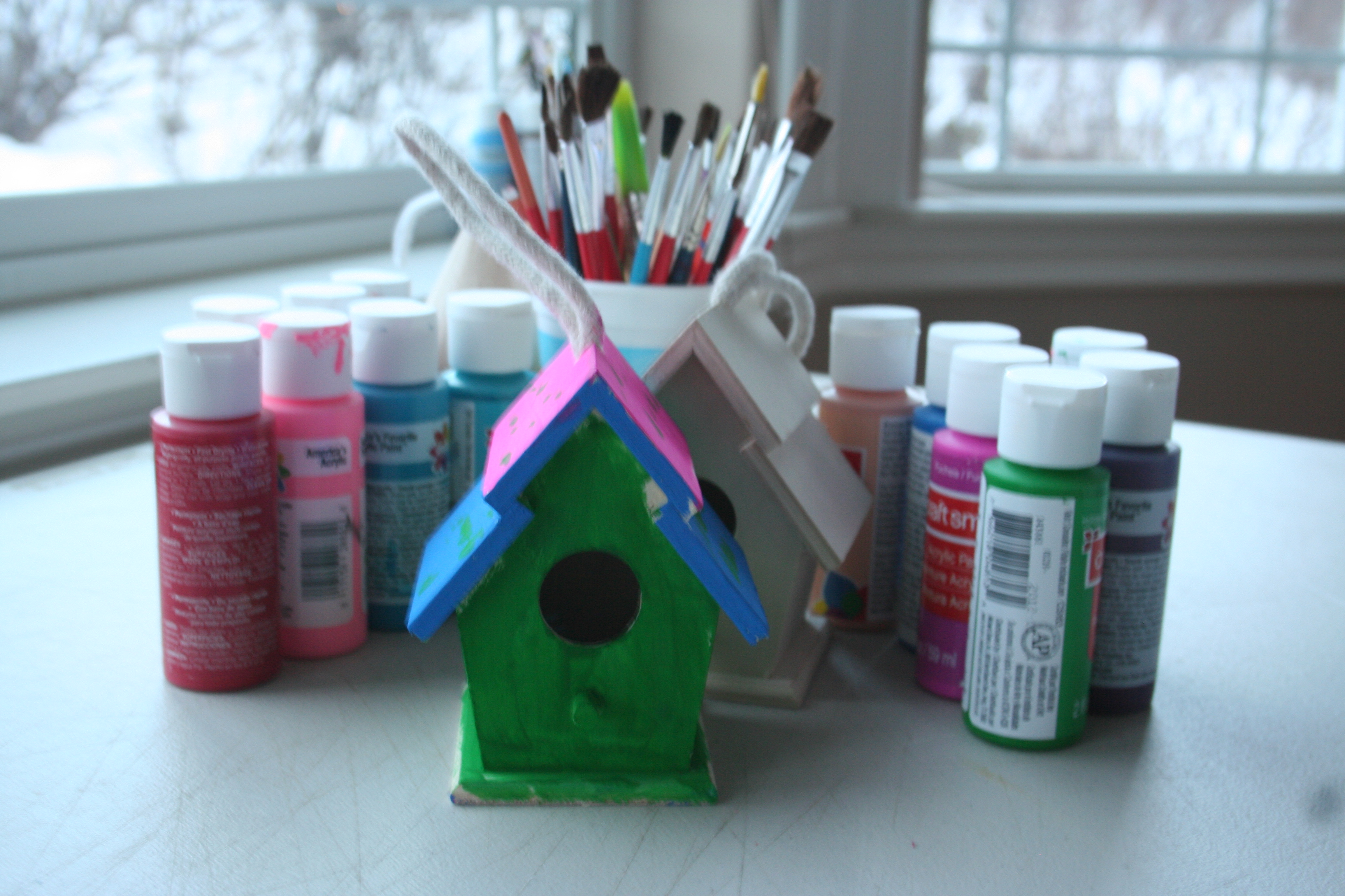 The party lasted for two hours, which was the right amount of time for the activities we had planned. The girls painted birdhouses (only $1 each at Michael’s) and made homemade bird feeders. I had planned to make the feeders with a pine cone base, but could only find scented ones (which could be toxic for the birds). As a last-minute backup we used bagels. It was simple to tie a ribbon on the bagel, frost it with a mixture of peanut butter and butter, and then dip in the seed of choice. Voila! (Except for those of us who live in bear territory… our feeders are all coming down!)