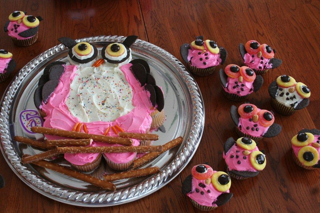 The cake is always the biggest source of stress for me, but this one was incredibly easy. We found the idea for a Mama Owl with owlet cupcakes on the Family Fun web site, and I didn’t even have to dig out my piping tools. Nice! Maggie requested the pink body and white breast (sans coconut), but otherwise we followed the recipe egg-sactly. 😉