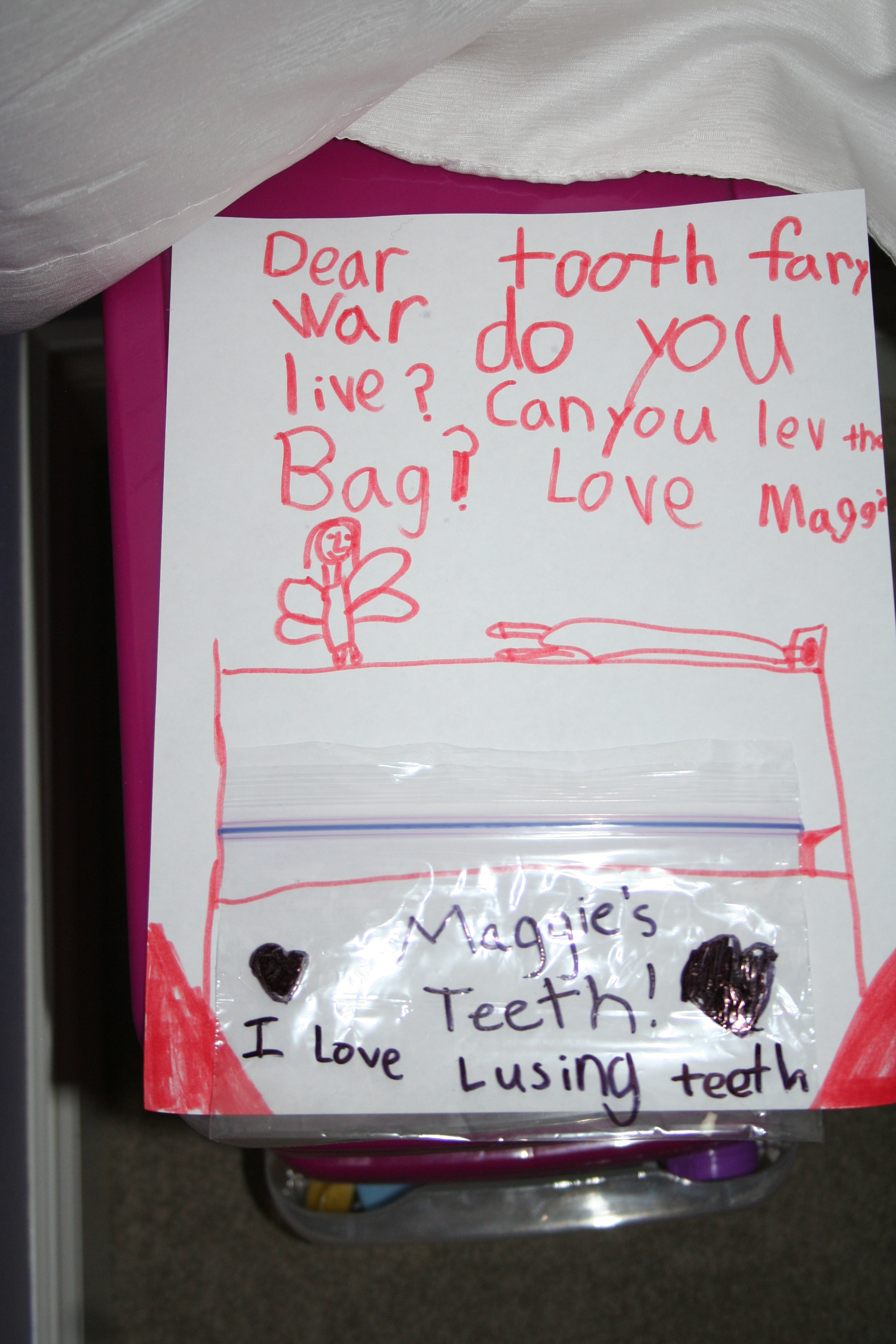Sam lost a tooth last week, and another one is ready to fall out two weeks ago. (Intentional poor grammar to make my point.) He’d been saving (forgetting) to put the tooth under his pillow, but now that Maggie had an offering for the tooth fairy he decided to put his out tonight too. As a result, we have two sleeping kids anxiously awaiting one tired fairy tonight: