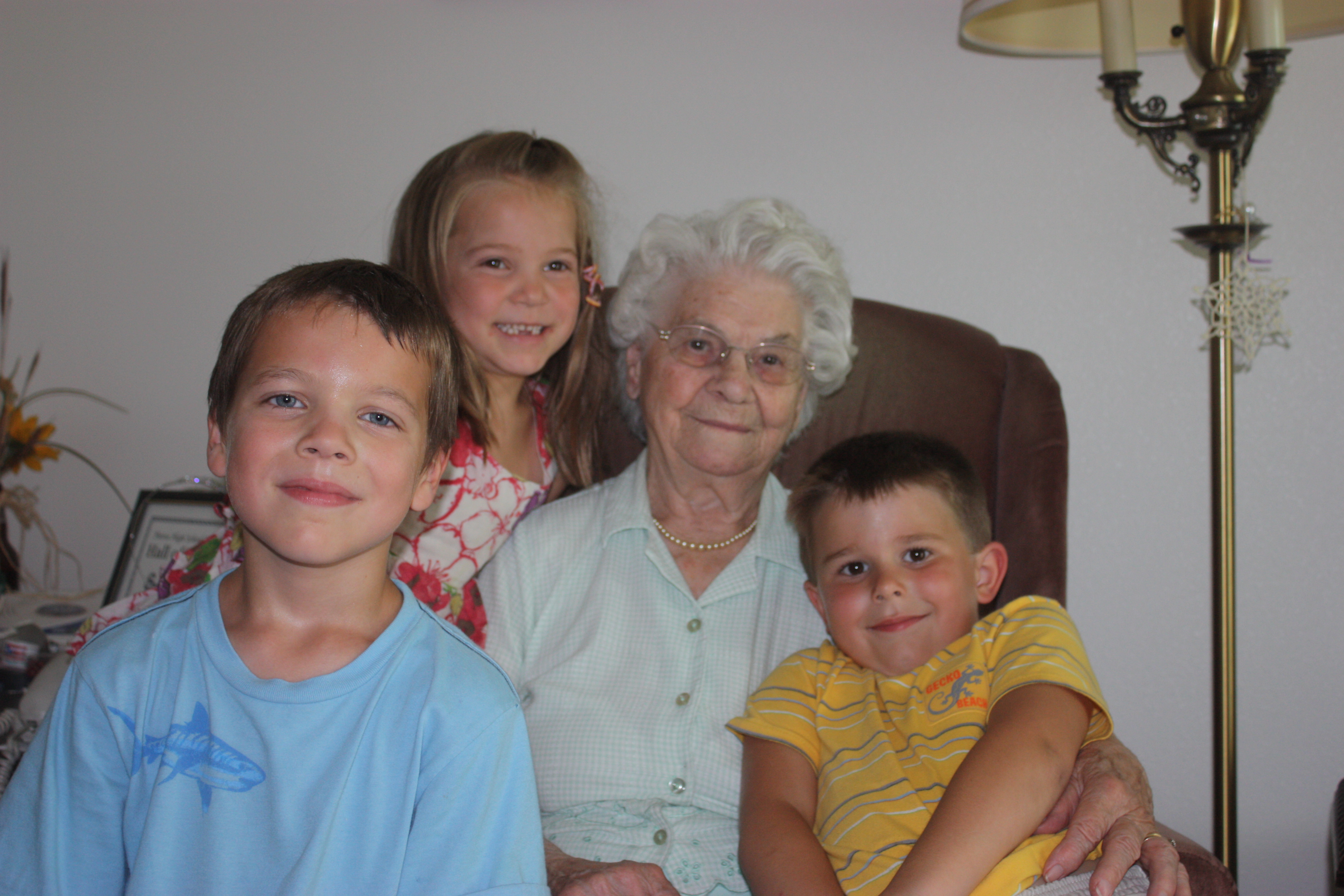 Grandma has visited us in Alaska twice. The first time she came with my mom when Sam was two-weeks-old, and boy did we need her. We were nervous new parents and she had a knack for calmly singing him to sleep on her chest. She came again last summer, and went salmon fishing with us in Prince William Sound. Here she is with the kids on our last night in Nebraska: