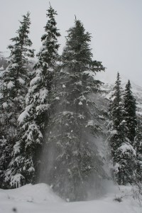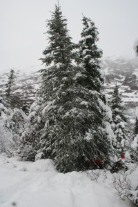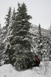 In case you’re wondering, this is all completely legal.  The Mat-Su Valley has designated tree cutting areas where we share a few acres with a dozen other families on a similar journey.  This year we headed south instead, to the Kenai Peninsula, where each household is allowed to take one tree from the Chugach National Forest as long as you are 150 yards from the road and water.  On the one hand, it was nice to be alone in the woods, where we didn’t have to watch other families skipping down the trail with the last decent spruce tree in the forest.  (Tree envy.  But at least those families were helping to break trail.)  This year we were on our own, wading through waist deep snow that, judging from the tracks, had barely been touched by anything but moose and vole.