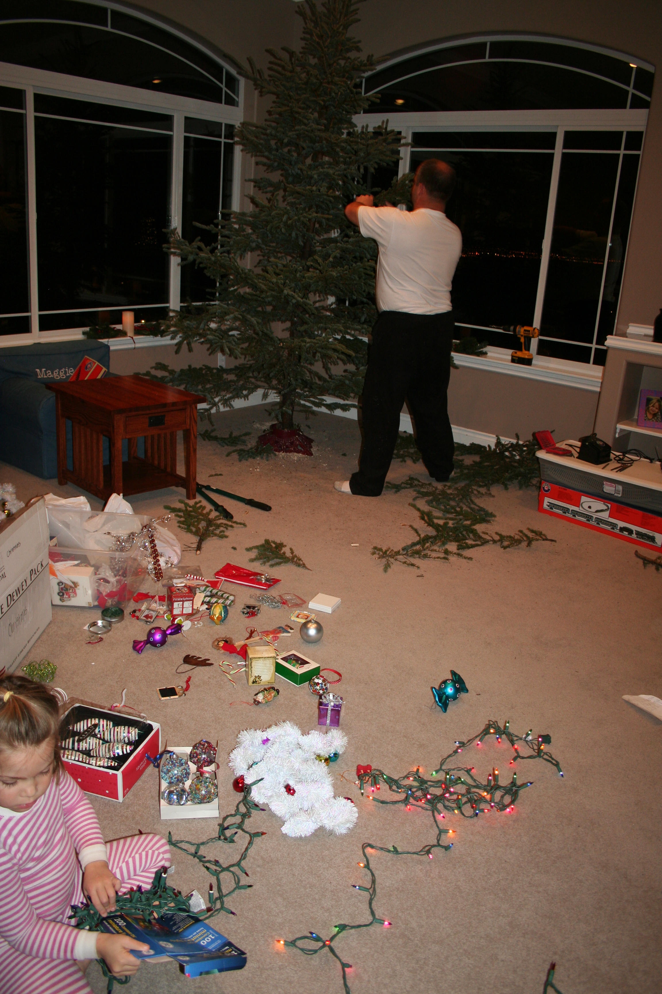 Eventually we did make it home safely, and after letting the tree thaw in the garage for a few hours we heaved it up to the living room.  (It was notably lighter when the ice chunks melted.)  I wanted to be festive and enthusiastic, but in all honesty I was crestfallen.  Our perfect tree was actually pretty pathetic, with gaping holes no matter which way we rotated the poor thing.  The kids could do flips through the gaps in this pitiful spruce – how did we not see this in the forest?  Either the piles of snow had disguised the holes or it was severely damaged on the transport.  Probably a combination of both.