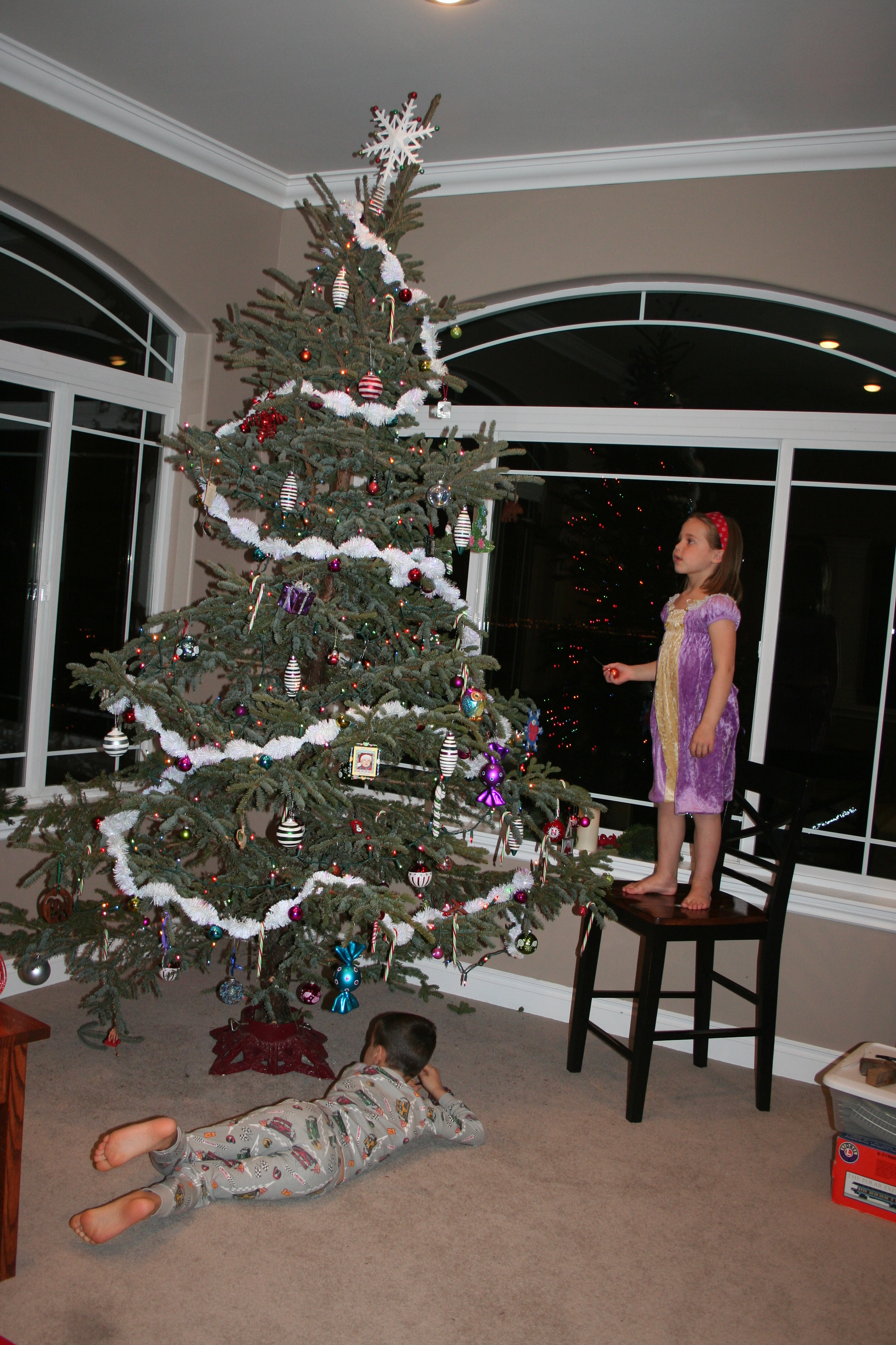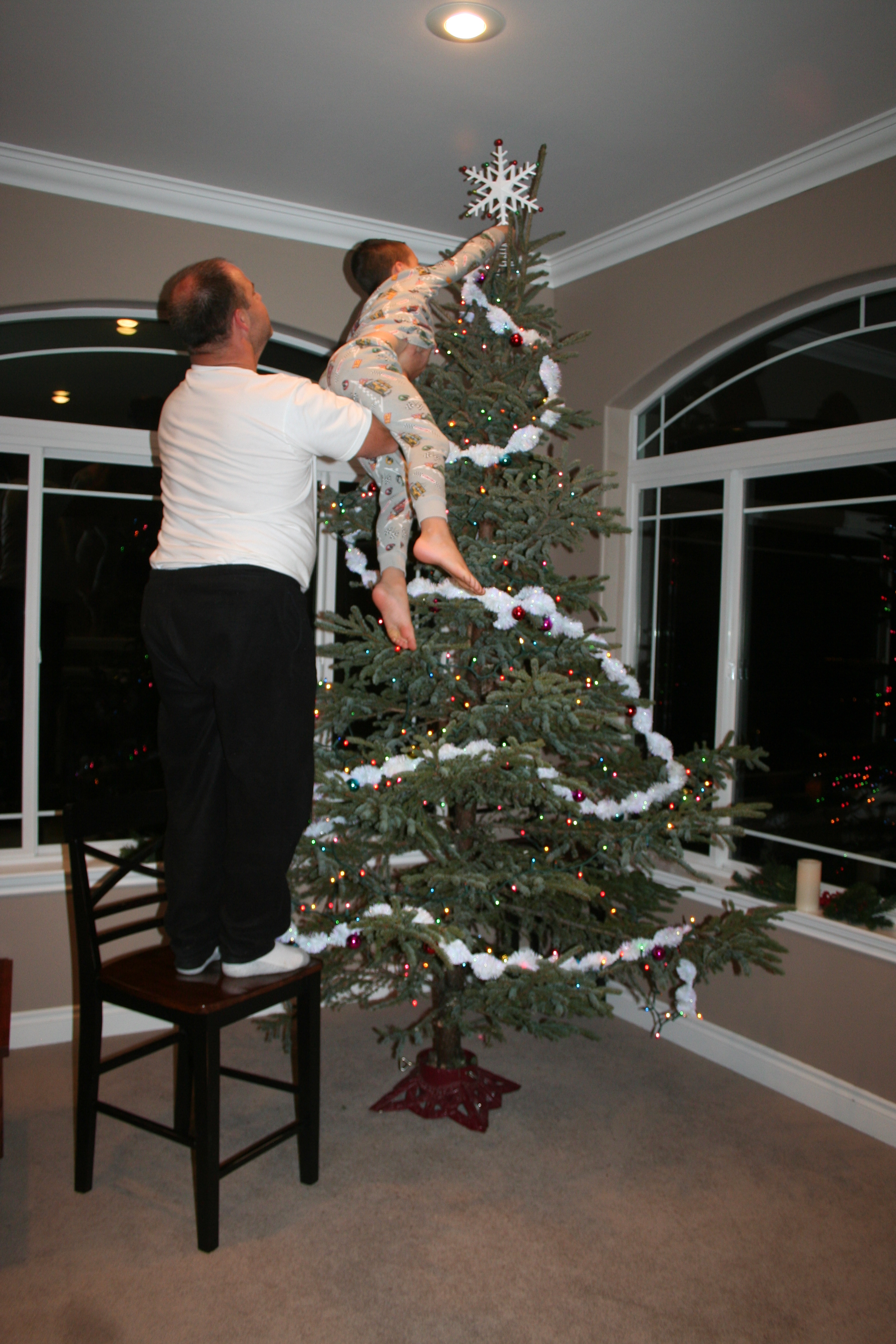 Sam and Maggie were so giddy about the tree trimming that they kept our spirits up.  Most ornaments brought about happy memories:  photos from the kids’ first Christmases, mementos from beloved family vacations, and a growing collection of homemade decorations the kids have created at school.  It was Sam’s turn to hang the star, and Clark lifted him to the top for the noble job: