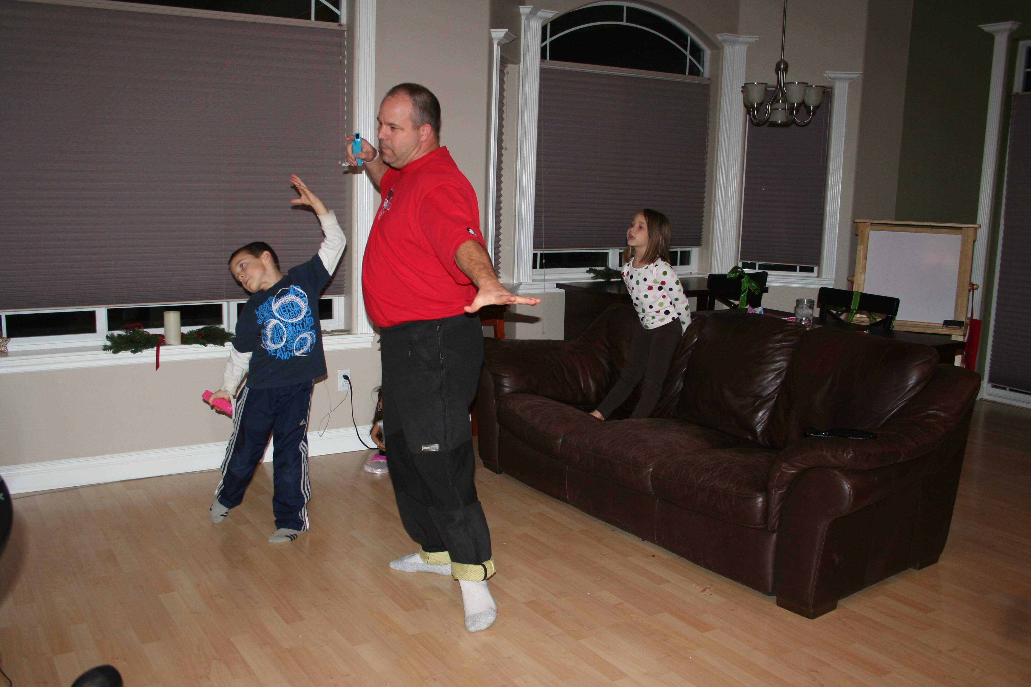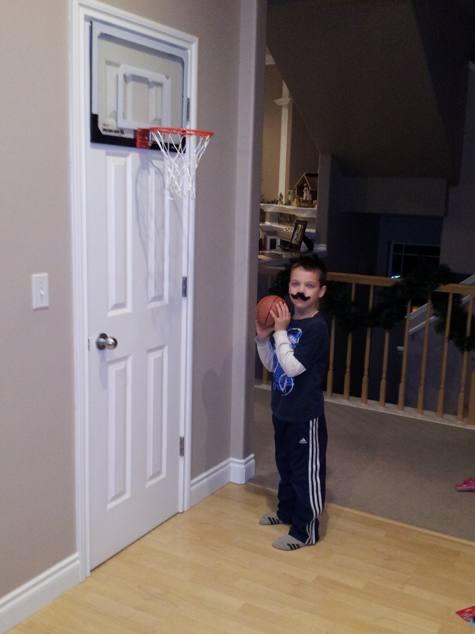 The day was spent exploring the new stuff. Clark and Maggie put together the ISpy Puzzle Sam picked out. Maggie and I built the Ivy and Bean paper dolls from Grandma. Sam pranced around in a fake mustache from Janelle, shooting baskets in a new hoop from Grandma. Clark and I nearly peed ourselves with laughter watching the kids jam out to Just Dance 4 on the Wii. (And then we nearly keeled over trying to play the game ourselves.)