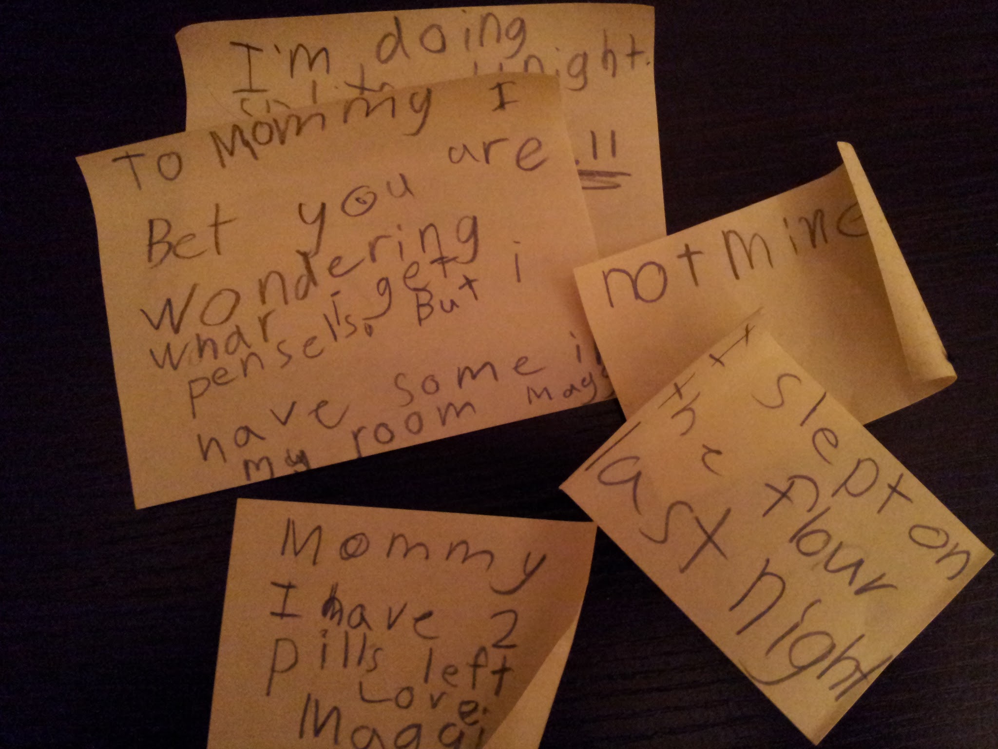 She’s on a kick lately, writing little Post It love notes all over the house. One day I accidentally put a pair of my socks in her laundry basket, and she politely returned them with a note declaring, “Not Mine.” For the past week she has snuck into our room and stuck random notes to our pillows every night: