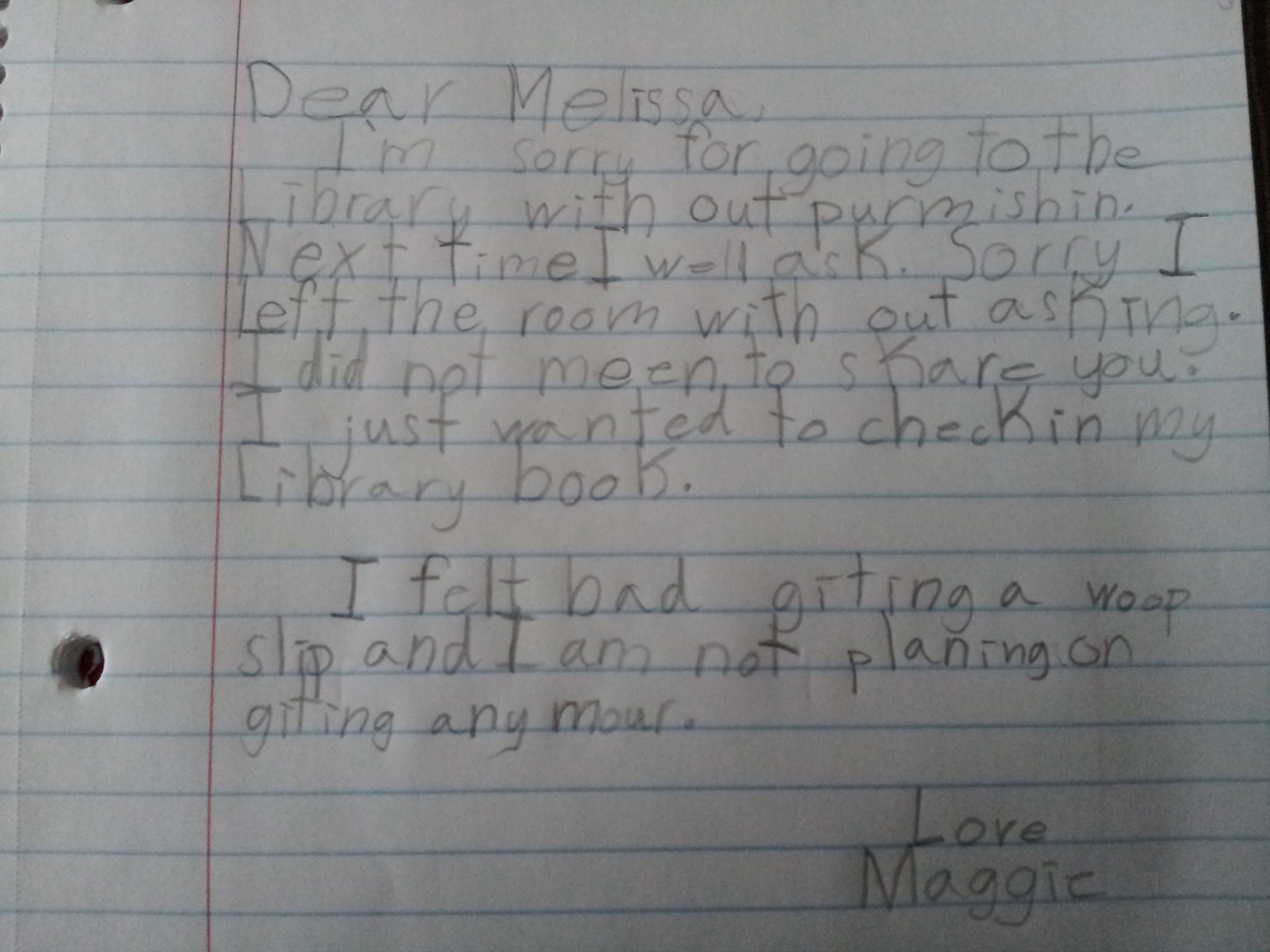 Tonight Maggie wrote her teacher a heartwarming apology note: