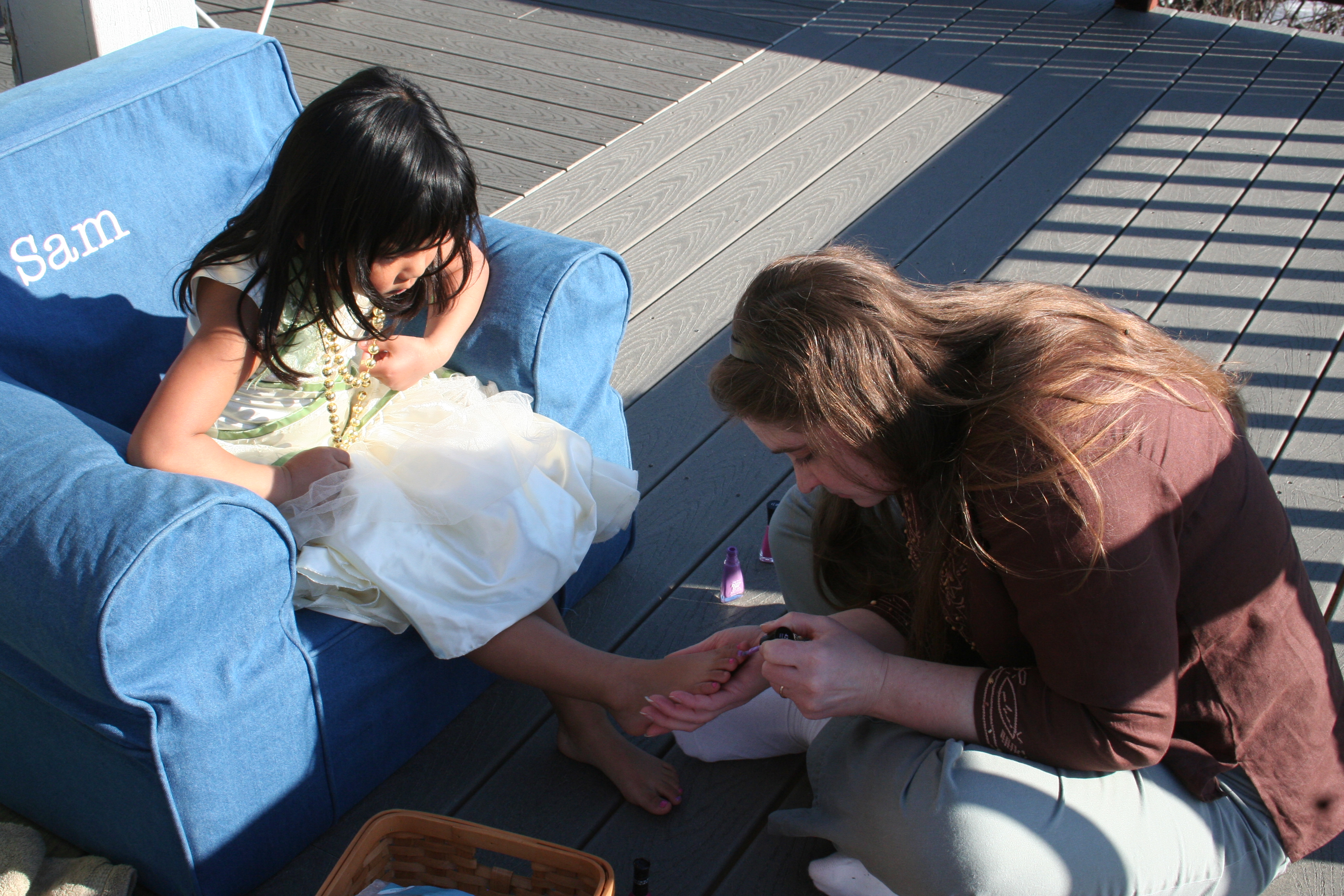 Soon it was time for the Royal Treatment: Every party guest was treated to a pedicure. We set up an assembly line of moms on the deck, and the kids had their feet washed, soaked, massaged, and moisturized before selecting the polish of their choice. This was a hit!
