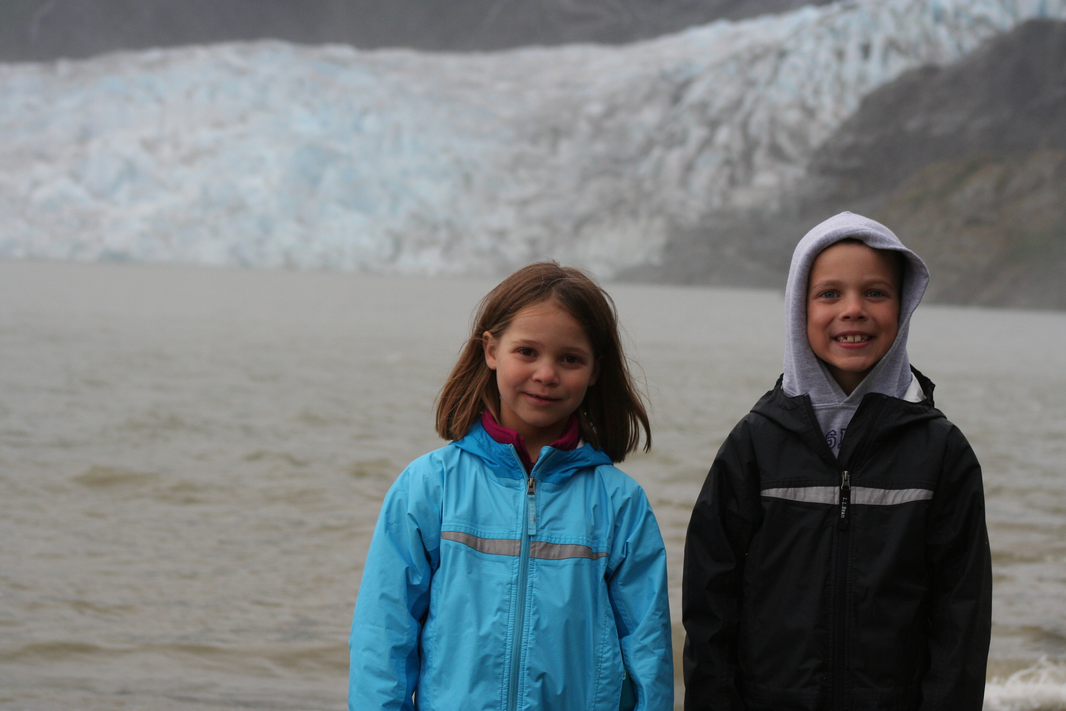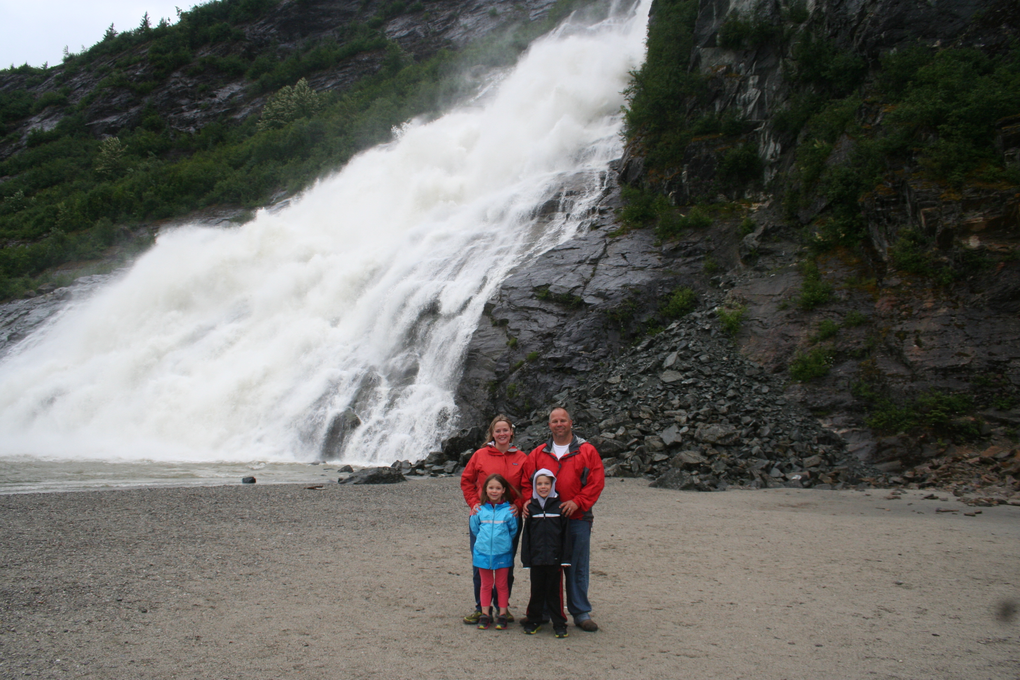 That afternoon we headed out to Mendenhall Glacier. It was difficult to see with the low clouds, but miraculously the rain stopped so we decided to venture down to Nugget Falls. (Maggie took some convincing, but about half a mile in she chippered up.) The falls were immense and powerful, and well worth the walk. Unfortunately, the rain returned in full force while we were at the falls. Suddenly we were the ones scurrying… right back to the car!
