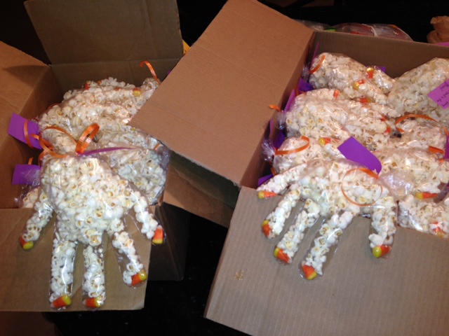 Once I finally had all the supplies, Maggie and I spent the entire night making 60 of these hands together. Clark and Sam were at football practice, and she was 100% devoted to this project. Honestly, I couldn’t have done it without her. She popped 13 bowls of popcorn, punched holes in the tags, and guided the candy corn fingernails to the bottom of each finger.