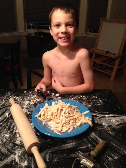 One night last week I was making chicken noodle soup, and Sam asked if he could make the egg noodles himself. It’s not like I enjoy dousing my hands in eggs and flour, so of course I said yes. He promptly whipped off his shirt (apparently his sleeves were getting in the way) and got to work on the dough: