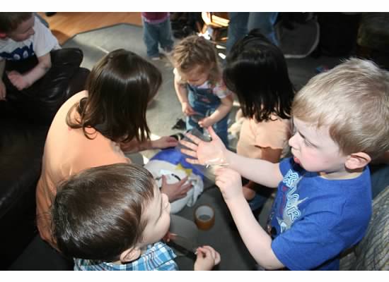We made a Humpty Dumpty pinata, and “put him back together again” after he was split open. The toddlers loved playing with the tape!