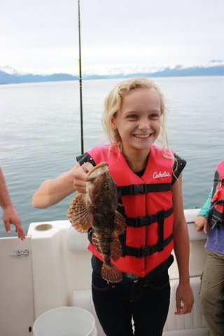 We raised the anchor and cruised toward the head of Port Wells, where we again saw the sea otters and pups. On the way back we stopped south of Pirate Cove to fish. There was another whale in the distance, but we focused on making some sandwiches and fishing instead. Kylie caught a Pacific cod, and when Dad got a bite he let Madi reel it up. It was an ugly Irish Lord with lots of worms, and Madi actually kissed it before we released it back to the sea. Yuck! Later in the trip Tyson caught a small black rock fish that we decided to keep, but that was the extent of our luck.