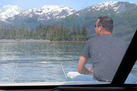 As usual, we motored to the kittiwake rookery for a few minutes. From there we went up Passage Canal towards our favorite spot – Hobo Bay. The seas were calmer than last week and the skies were clearing. It was blue and the mountains and glaciers looked impressive. Even with 10 people on board Clark was able to get the boat on step as long as most of us stayed down in the berth. The kids all slept on the drive out: