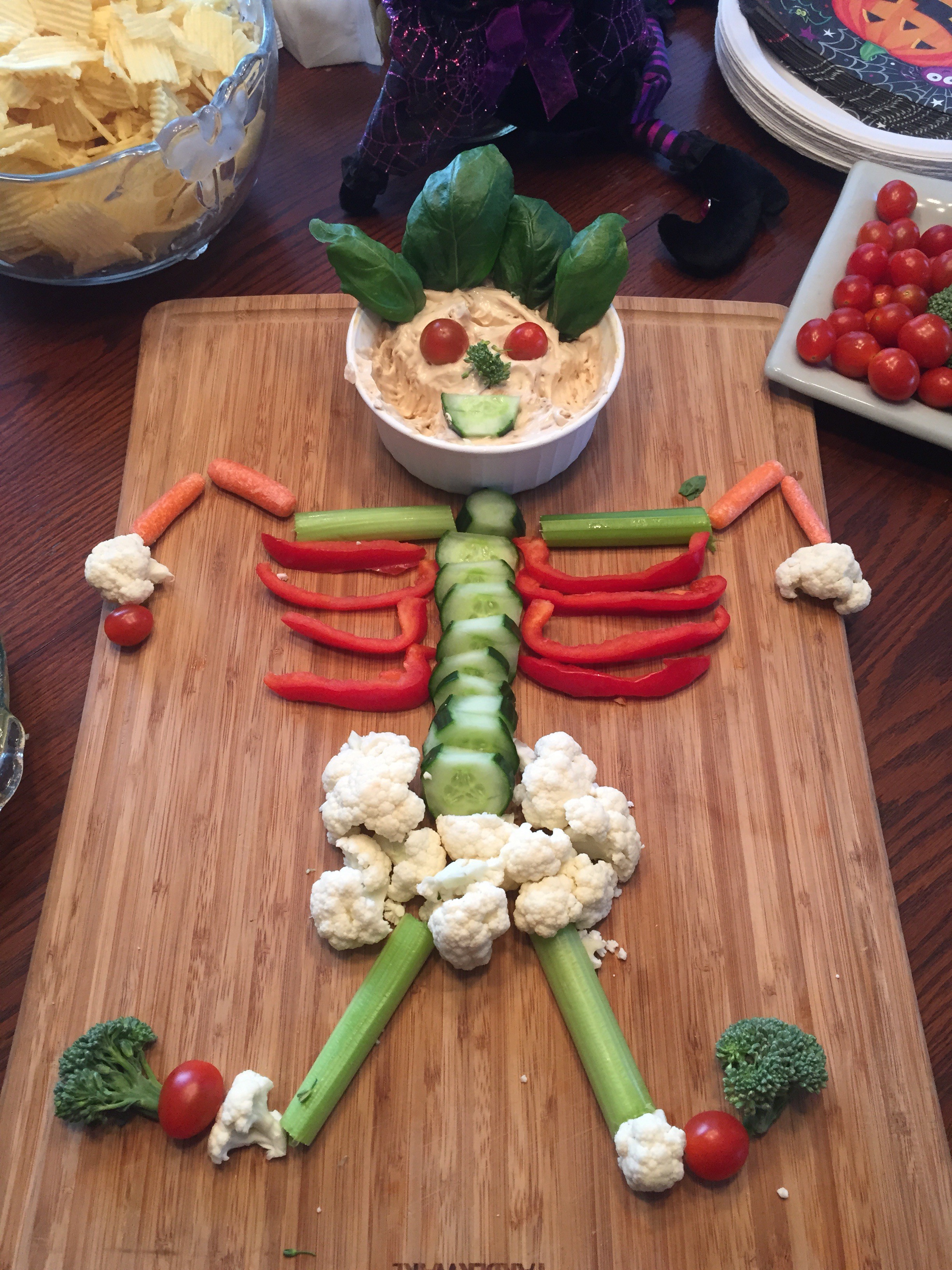 It might be my very favorite holiday. The Pinterest possibilities are precious, and this year we created a skeleton veggie tray, jack-o-lantern taco dip, witches hats, and witches broomsticks.
