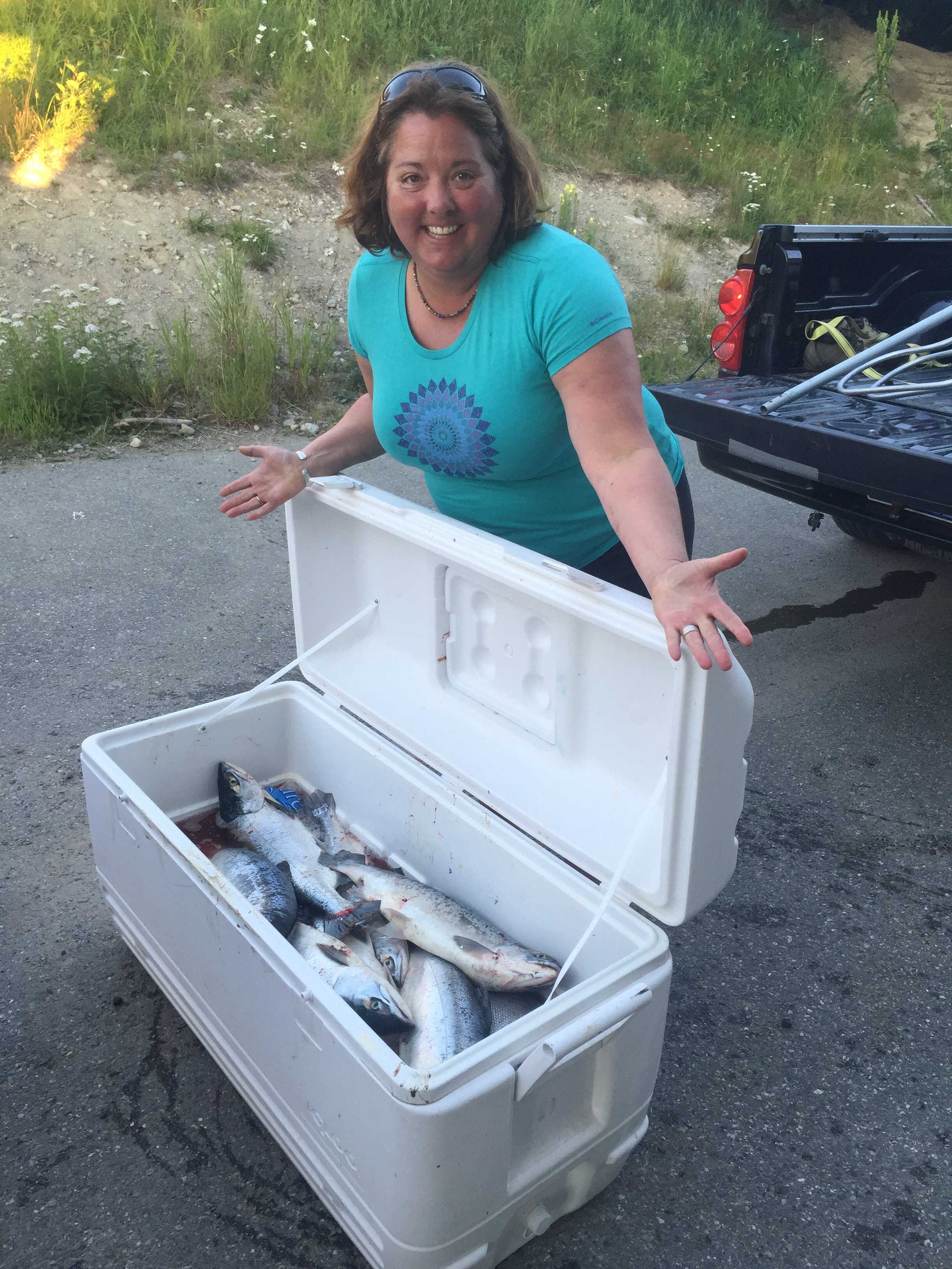 In the interest of time, let’s fast forward to 2016 and our badass solo dipnetting excursion. It ended well, but I have an irrational fear of driving Kenai Beach. I’m always terrified we are going to get stuck and the tide will swallow our truck. It’s a bumpy ride and you have to keep your foot on the gas, even when there are young children and horses meandering in your path. (True story.) Every year I swear I’d rather take my chances and swim with the salmon than drive that beach, yet every year I go back and do it again. (From the passenger seat, of course.) Throw in my profound dread of bonking (#slaughtering) salmon and the notoriously disgusting PortaPotties, and let’s just say this isn’t your typical beach experience. But look at that cooler of fish we bring home every time!