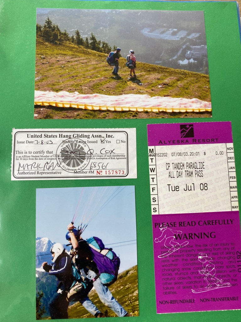 In hindsight, this has been going on for nearly two decades. Exhibit A: In our pre-kid days we spent a leisurely afternoon hiking the Winner Creek trail in Girdwood, only to cap it off by spontaneously launching ourselves off Mt. Alyeska in tandem paragliders. I wish I had better photos, but this was before cell phone cameras. Here’s the page from my scrapbook: