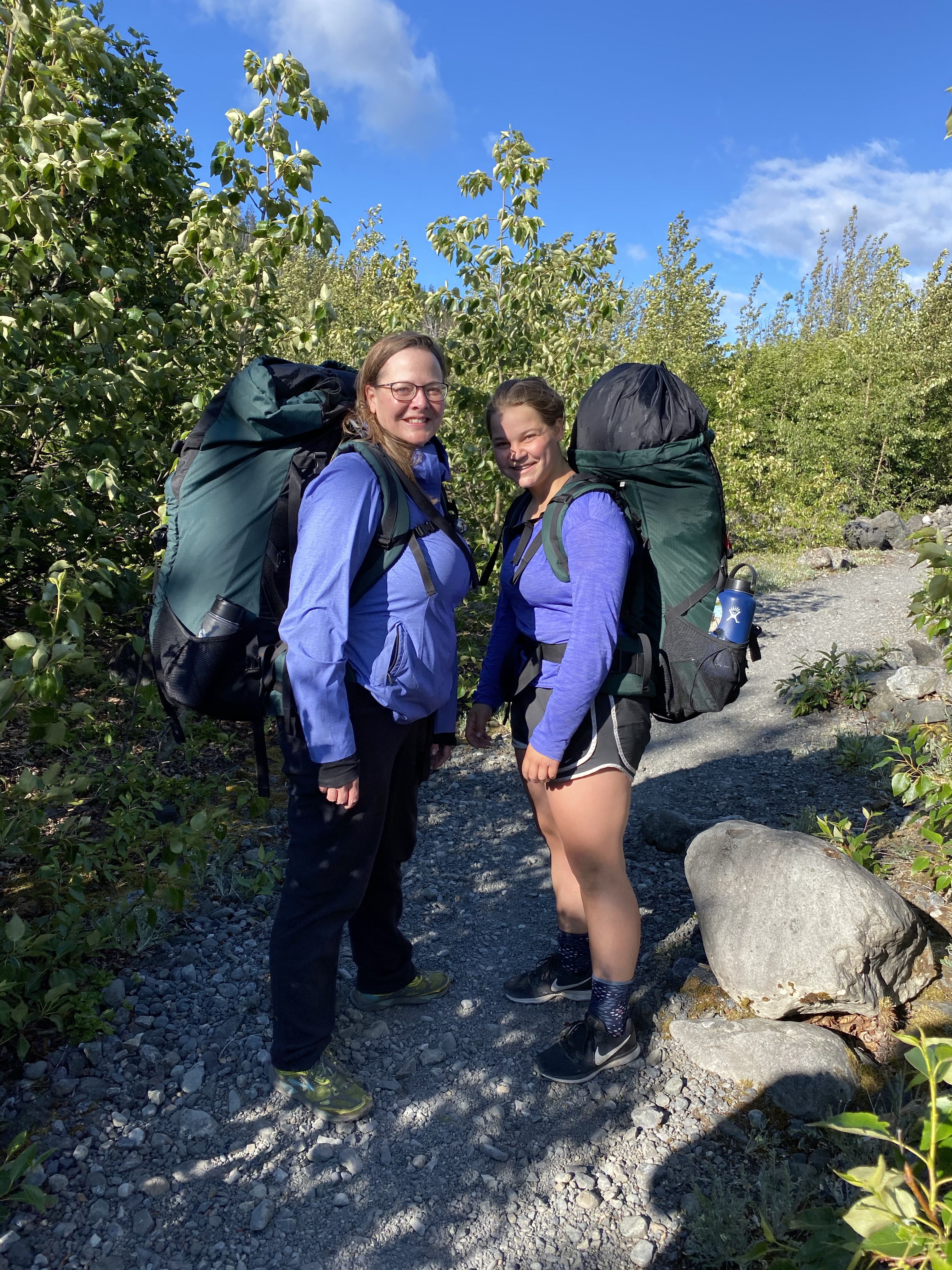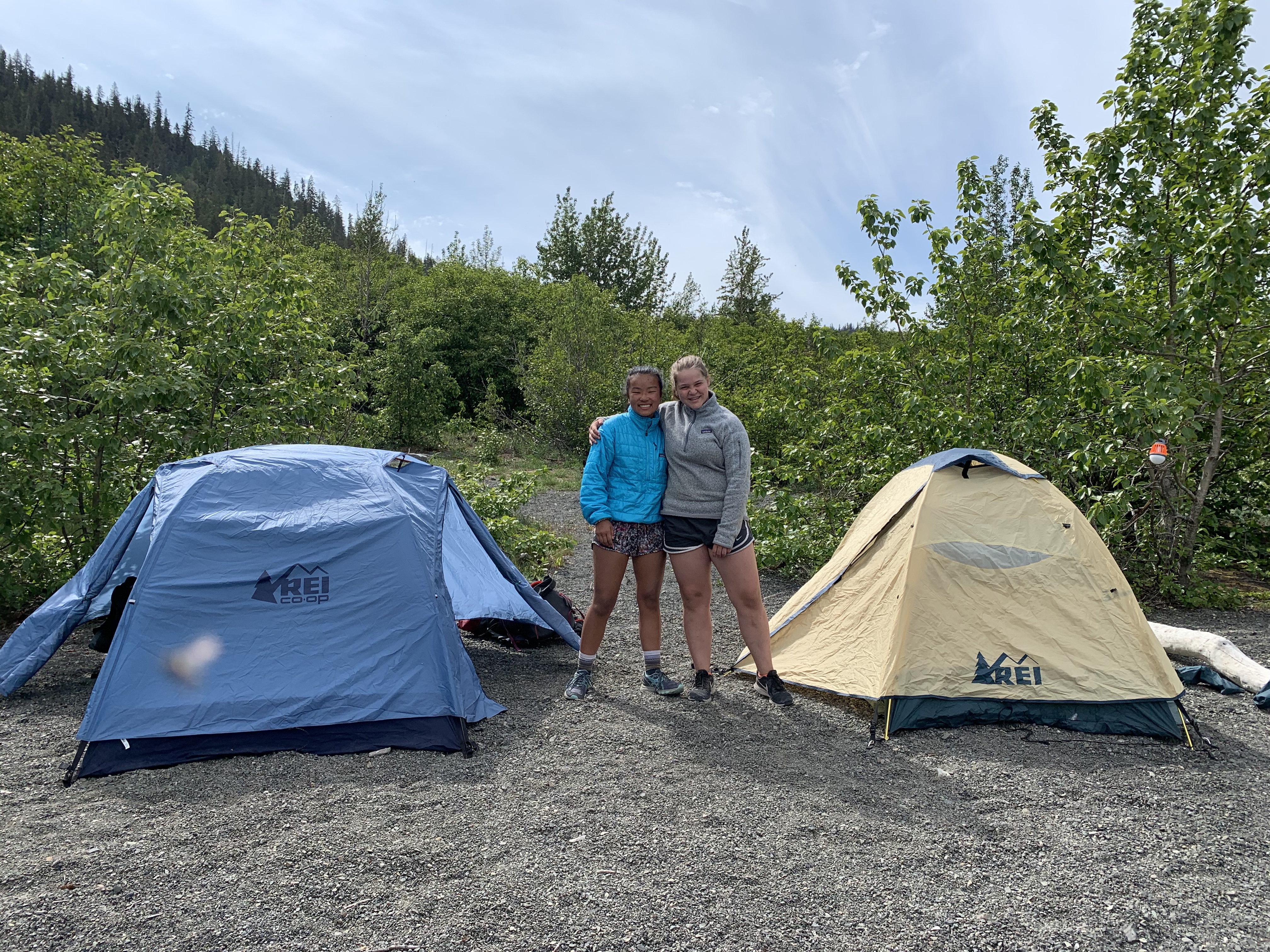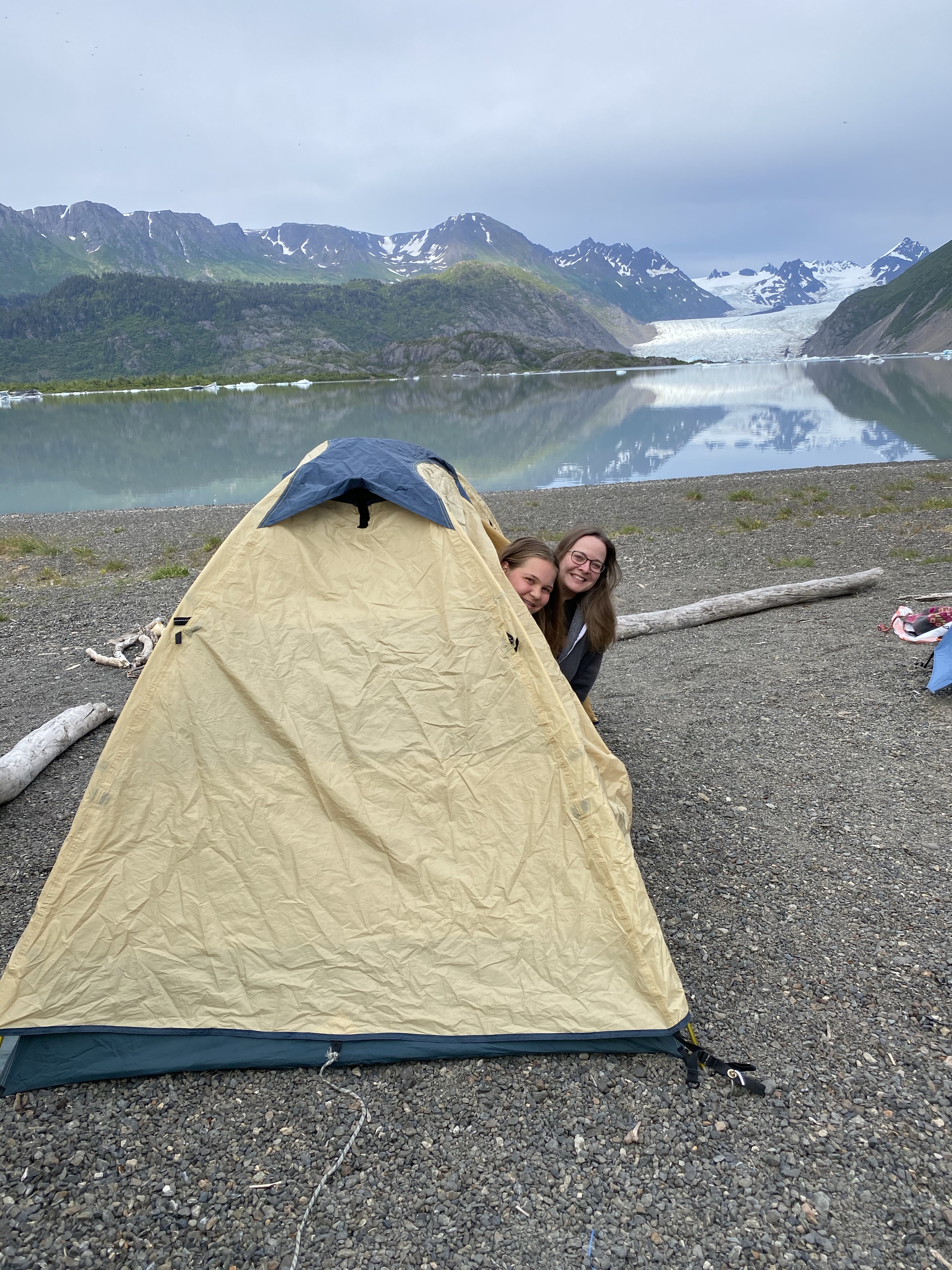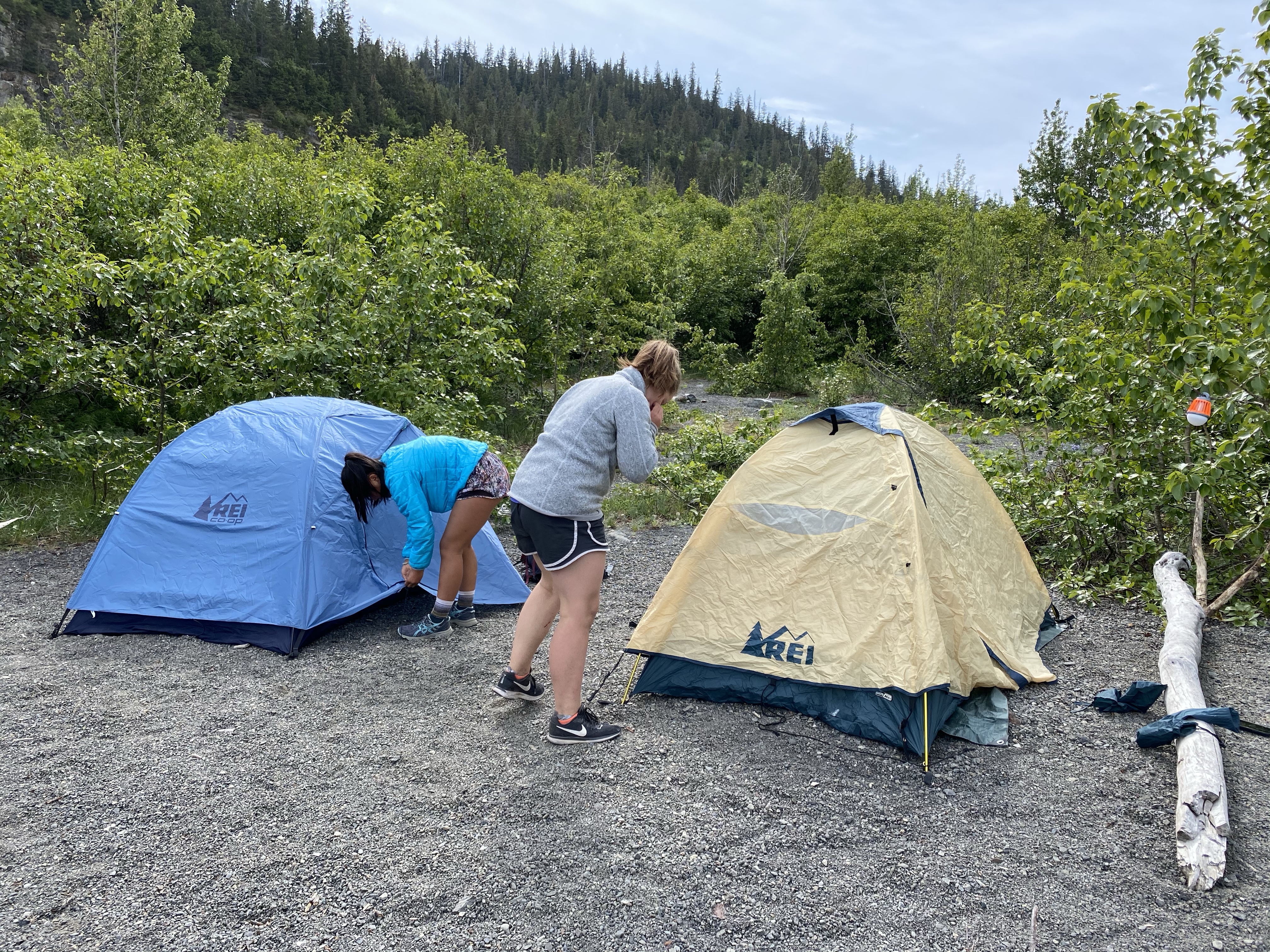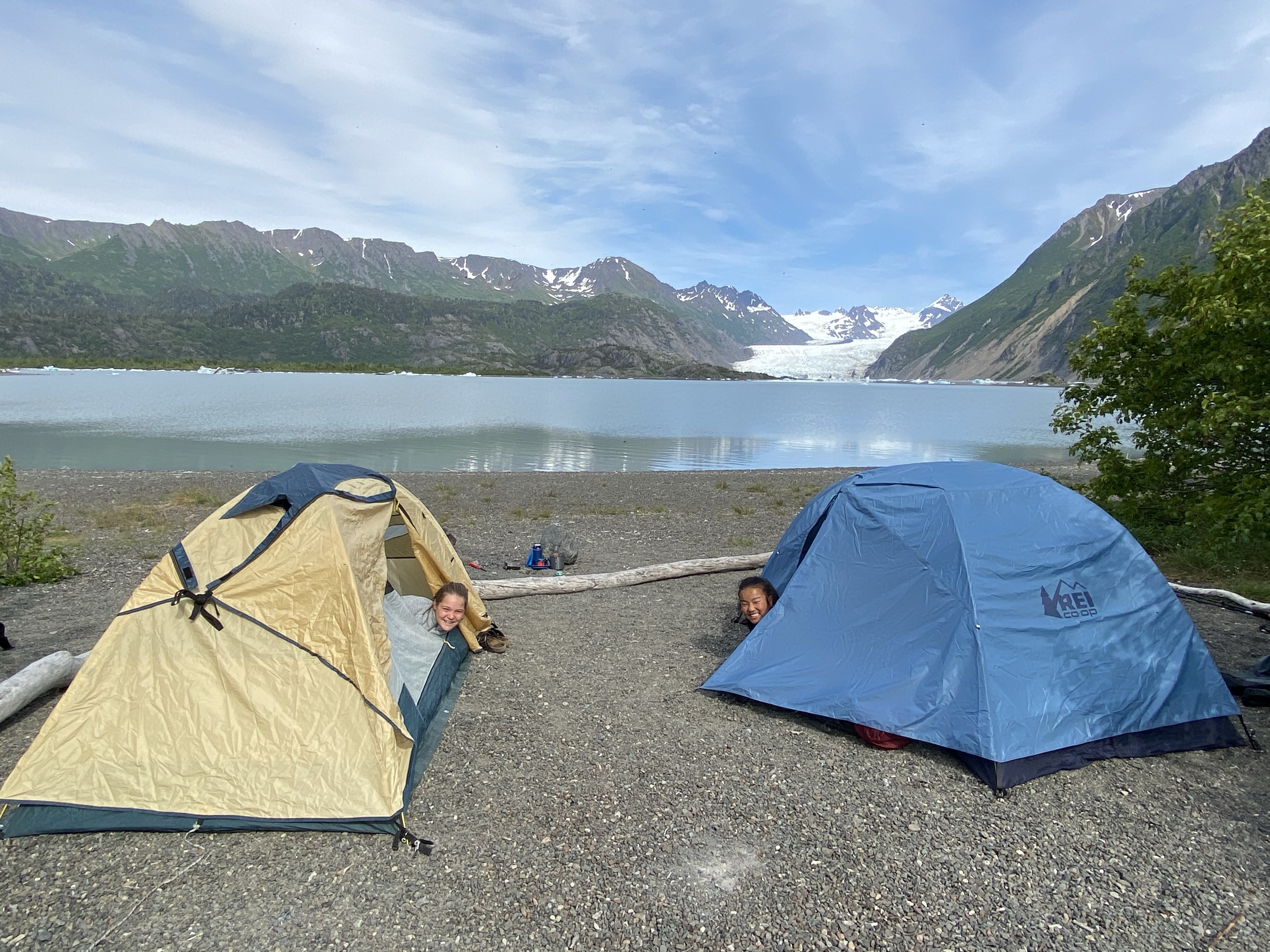 Next came the backpacking excursion to Grewingk Glacier. I’m not gonna lie, this one was so far outside my comfort zone I almost bailed at the last minute. It started calmly enough, with a five-hour drive to Homer and a comfortable cabin. We ate in a restaurant for the first time in months, and it felt so strangely normal. (The restaurant was Fat Olives – everyone wore masks, and they only allowed three tables in the entire dining room.) Back at camp, the girls played volleyball and demolished us in a game of Pitch. It was a lovely evening.