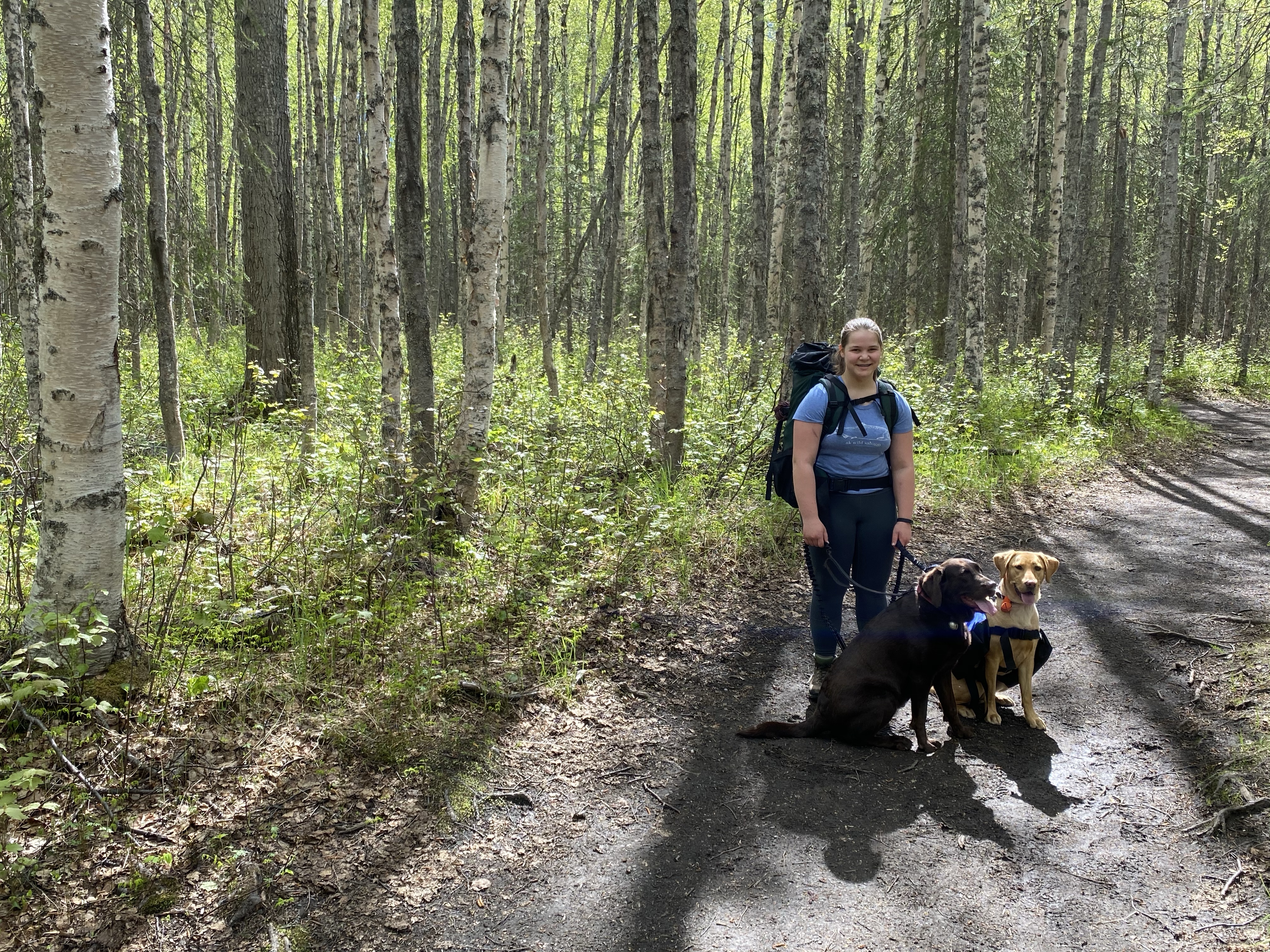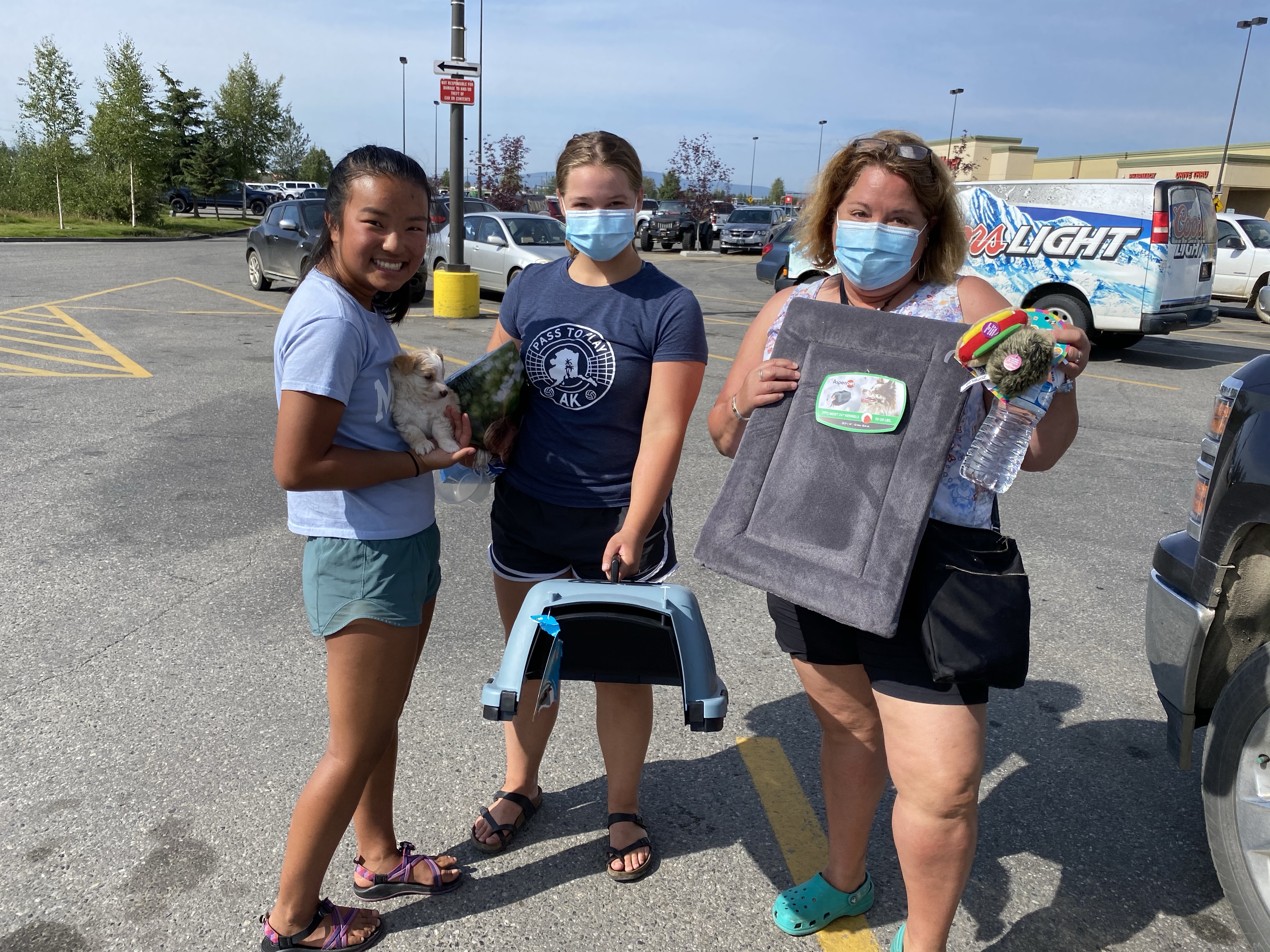 The next day we went to Birch Hill, where the girls biked and Nancy and I walked a loop. Before heading home we decided to stop at the Fairbanks Costco to see if they had bleach wipes and disposable face masks, which were impossible to find in Anchorage. On the way we stumbled across some puppies for sale, and I pulled in so the girls could pet them. I hoped they were Huskies since we didn’t see any in Denali. It turns out they were a Husky, Pomeranian, and dachshund mix. (How does that happen?!)