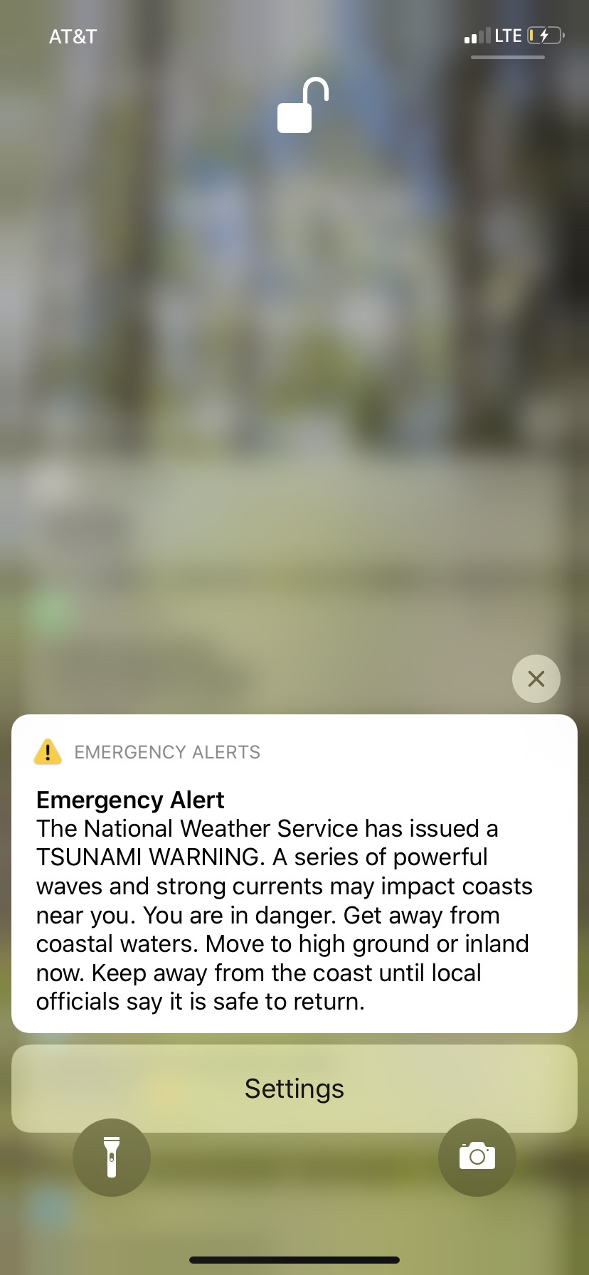 “Emergency Alert: The National weather service has issued a TSUNAMI WARNING. A series of powerful waves and strong currents may impact coasts near you. You are in danger. Get away from coastal waters. Move to high ground or inland now. Keep away from the coast until local officials say it is safe to return.”