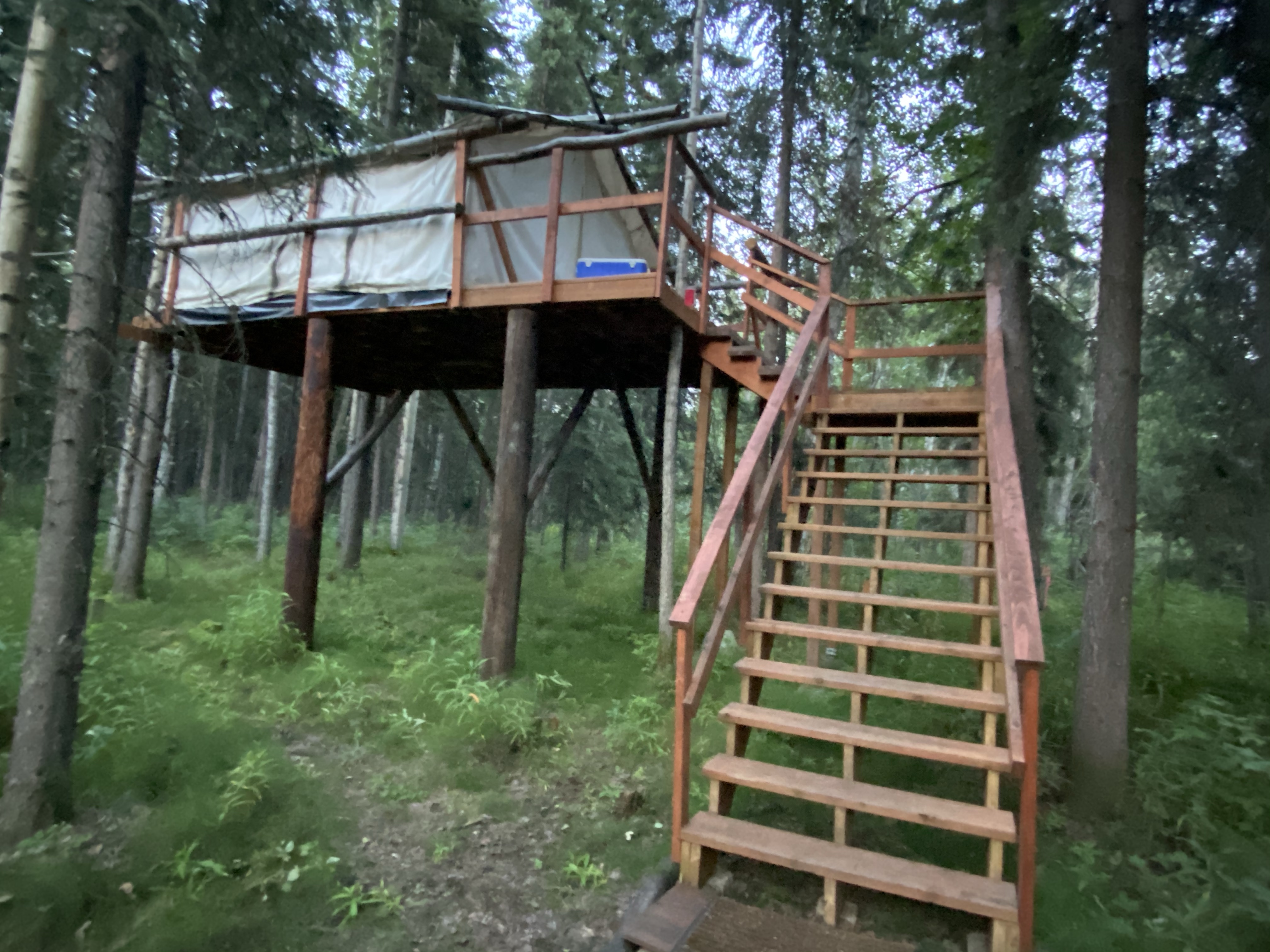 This trip was more glamping than camping; we stayed in an adorable treehouse at Sven’s Basecamp Hostel in Fairbanks. The place was stocked with a kitchen, bathroom, coin-op showers, fire pit, and game cabin.