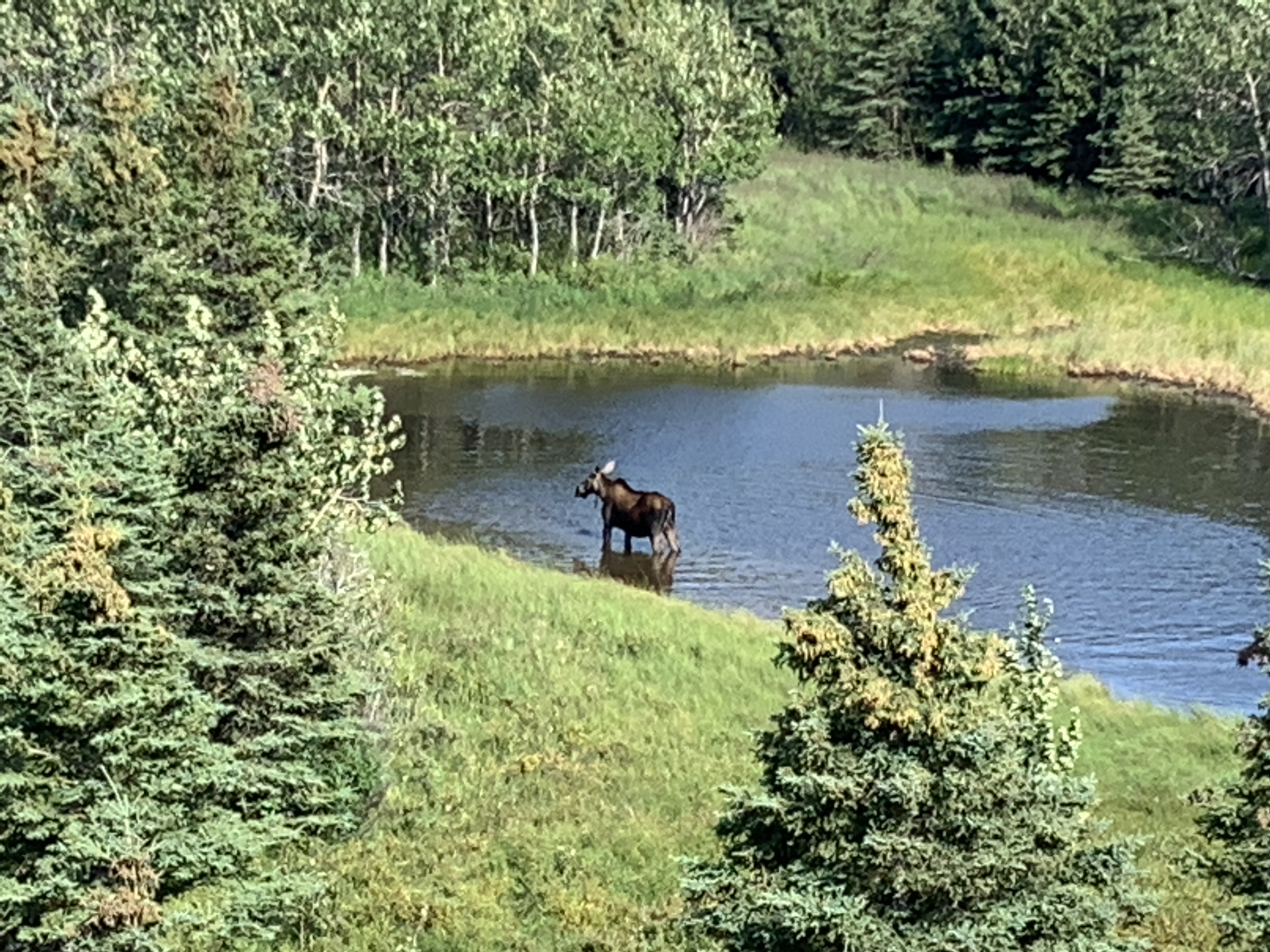 The trail is notorious for wildlife, so my hackles were up, bear spray ready, and I kept a constant eye ahead for bears and moose. Apparently I should have been looking up instead. About 20 minutes into the hike we ambled upon a man with a huge camera around his neck. “There’s a bear up in the tree behind you,” he casually reported, pointing skyward.