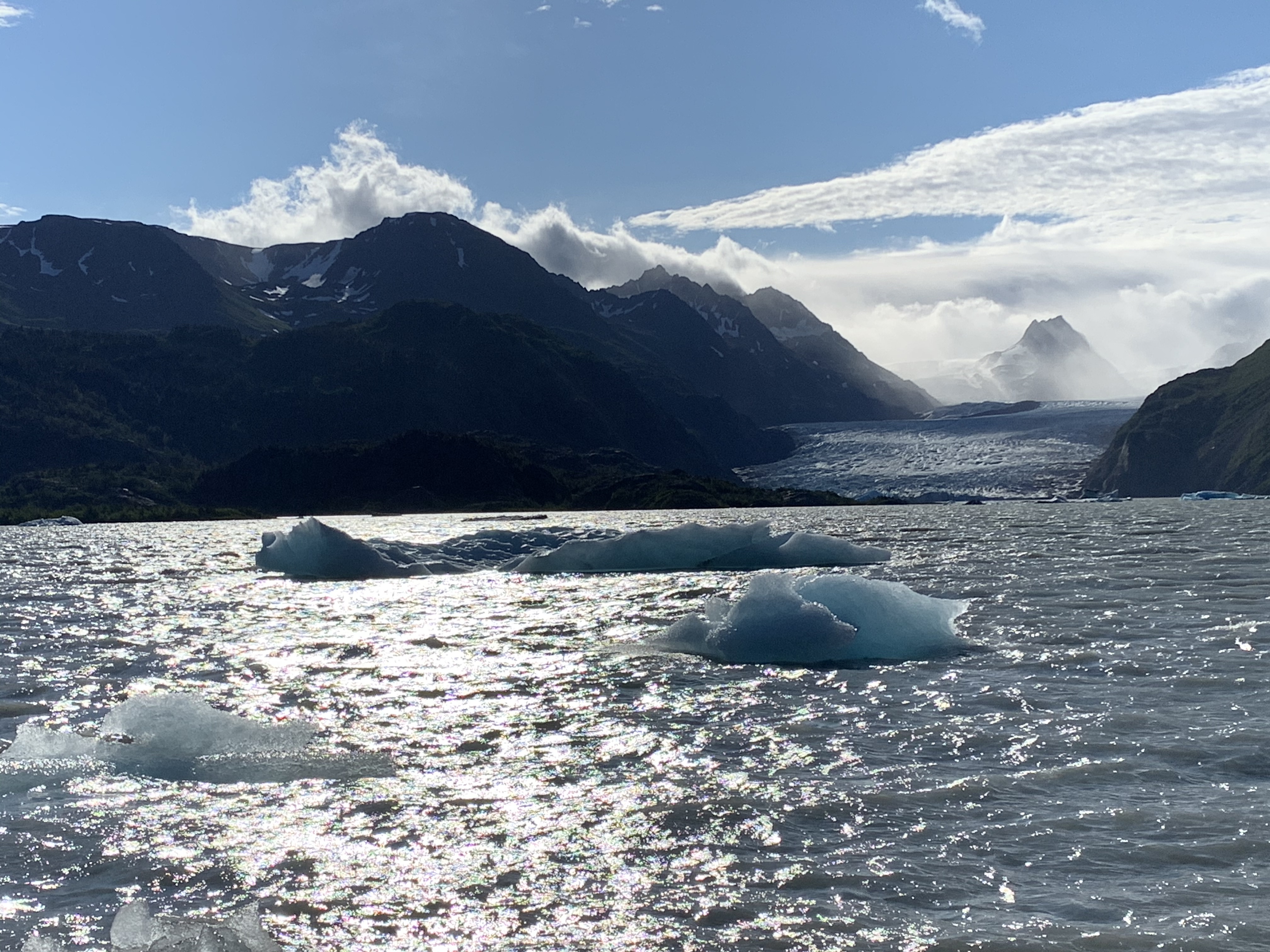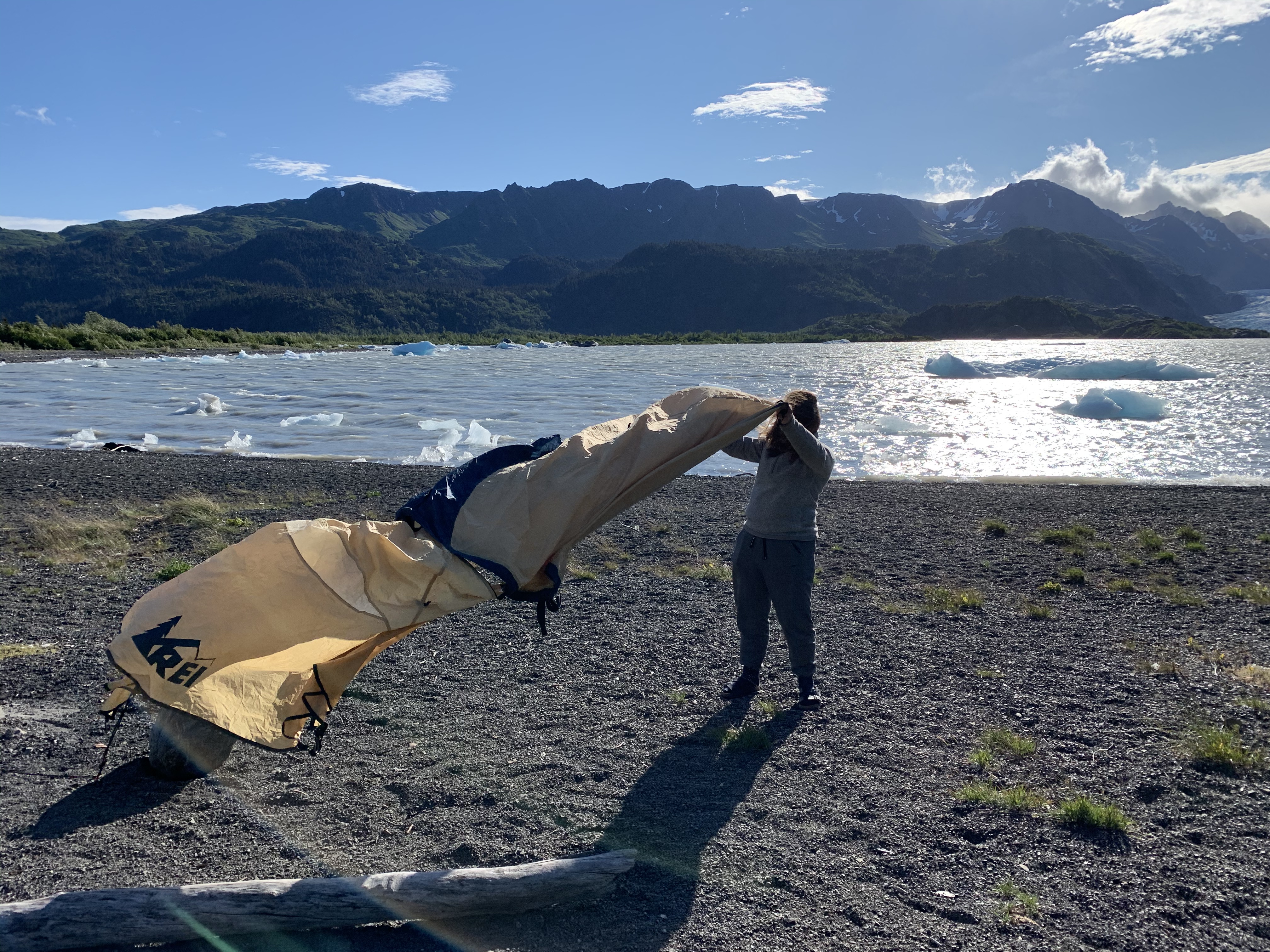 We emerged a little shell shocked the next morning. The previously placid lake now had waves, and chunks of calved glacier ice were lodged on the shore near our campsite. The wind made it a challenge to take down our tents. We broke camp as quickly as possible, and thankfully the wind was no longer an issue once we hiked away from the lake.