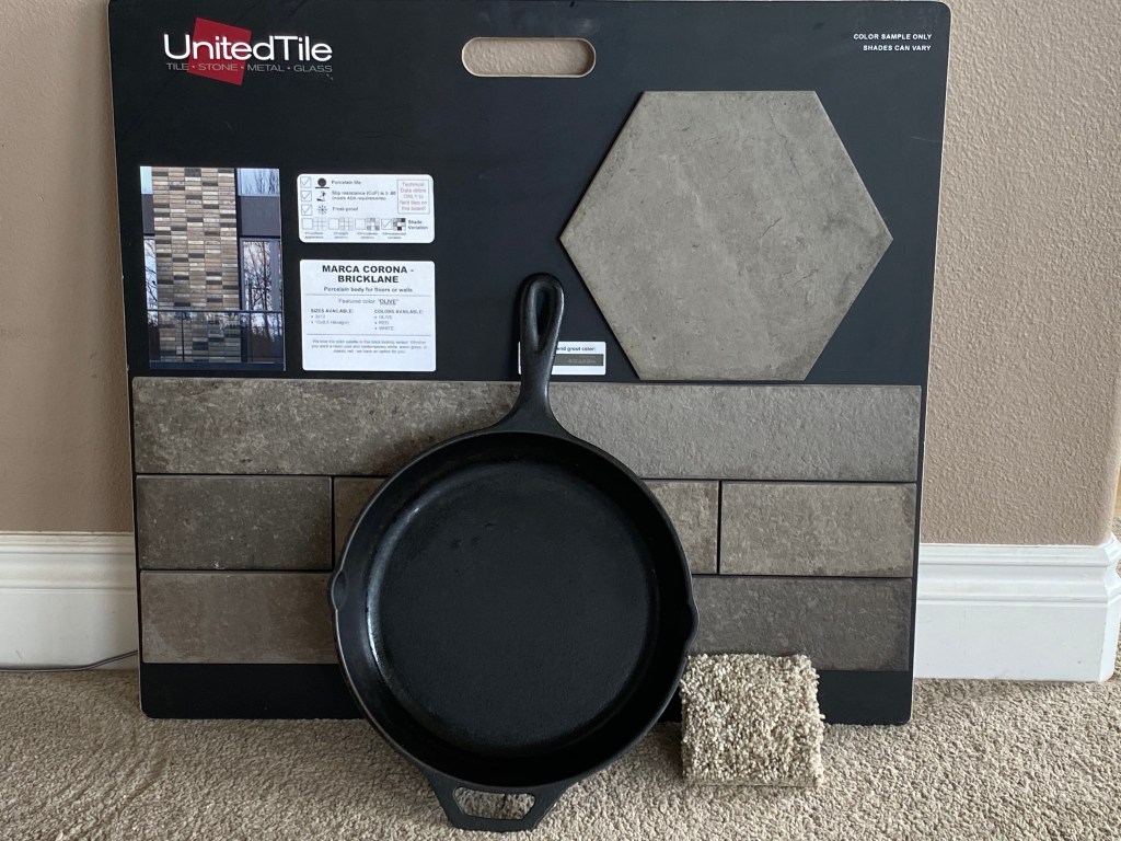 First up: material for the surround. I hauled home dozens of sample boards and propped them against our walls. (The cast iron skillets represent the stove… what can I say, I’m a visual person!) The two finalists were stack stone from Home Depot (MSI Trevi Gray) vs. tile from local treasure Curtis and Campbell (UnitedTile Marca Corona Bricklane in Olive).