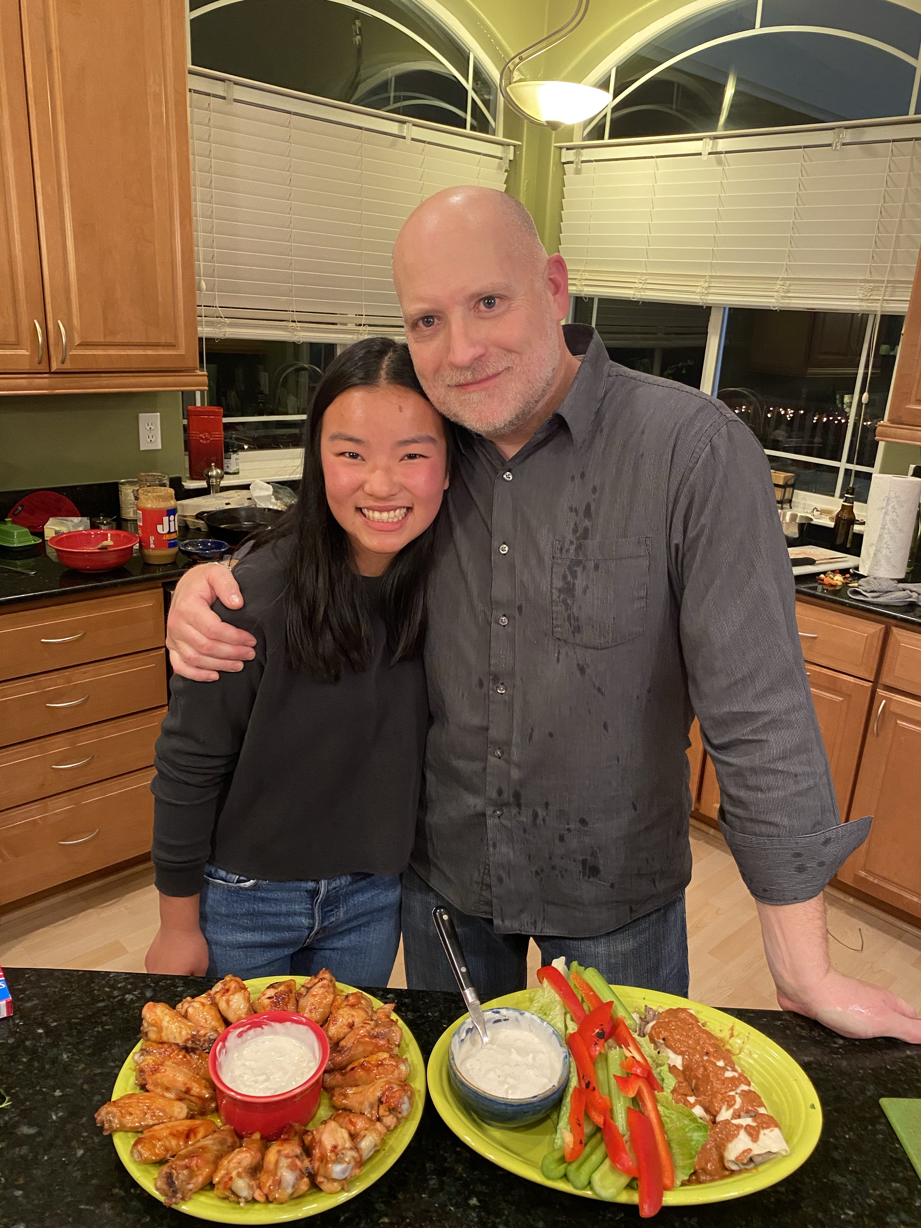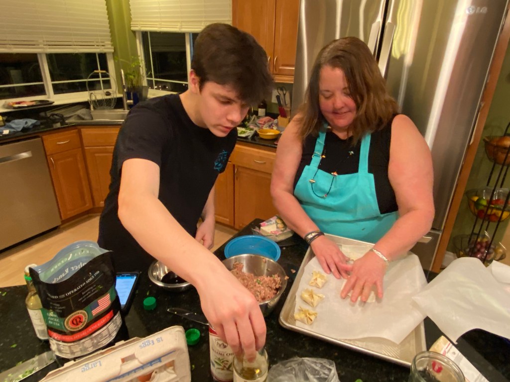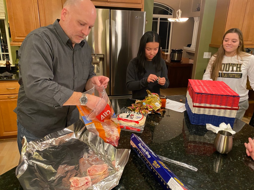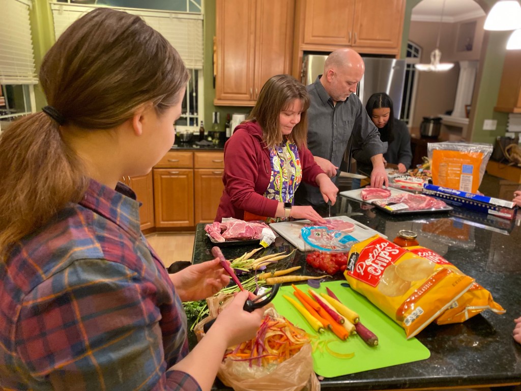 It’s crazy that Nancy landed this basket, since she makes dumplings a few times a year and recently gave us a tutorial on the process. They snatched garlic, ginger, rice wine vinegar, spinach, and scallions from the pantry to mix in with the pork, and then Nancy steamed the dumplings. Sam made the sauces and downloaded music for the presentation, in addition to preparing a speech. My birthday coincided with Chinese New Year, so they presented their dish with a speech about how people born in the Year of the Rat are known for their compatibility. Sam created a metaphor about the compatibility of his two sauces: the traditional dumpling dip and the nontraditional with cheese and aioli. It was a stretch, but the traditional sauce and dumplings were a hit. We devoured them!