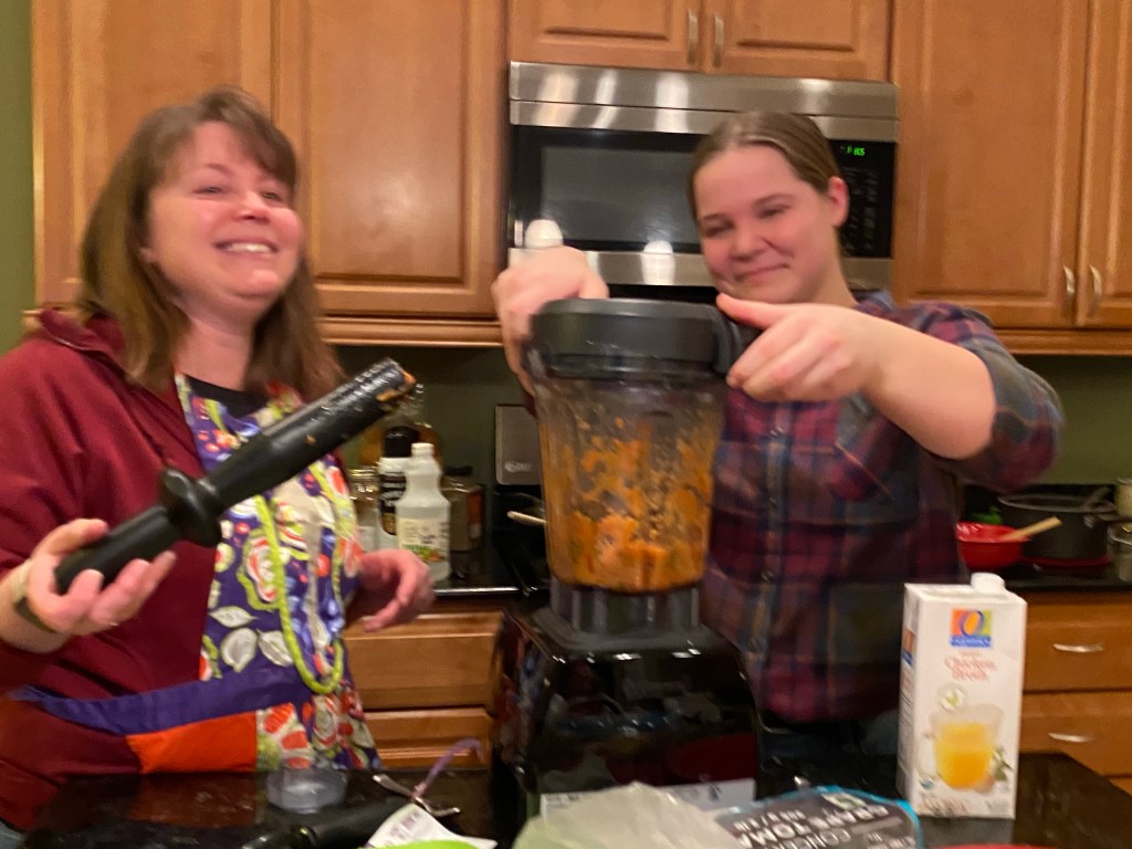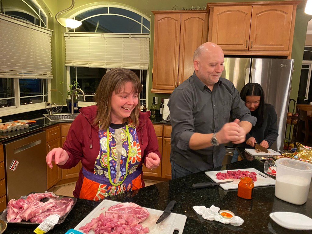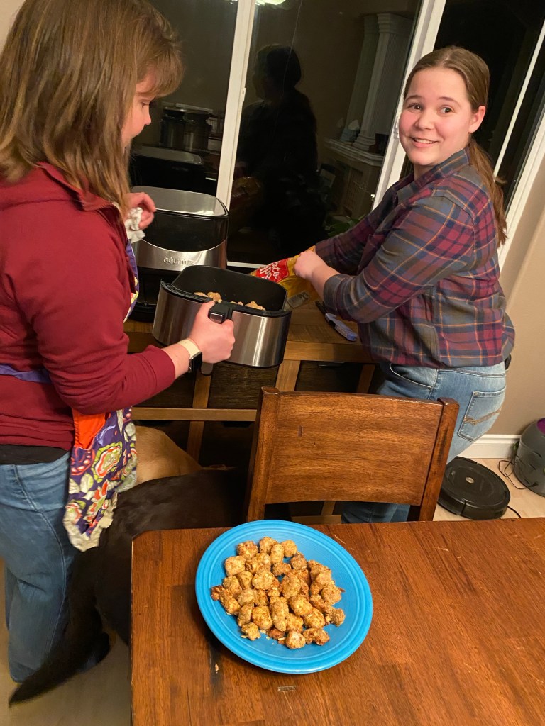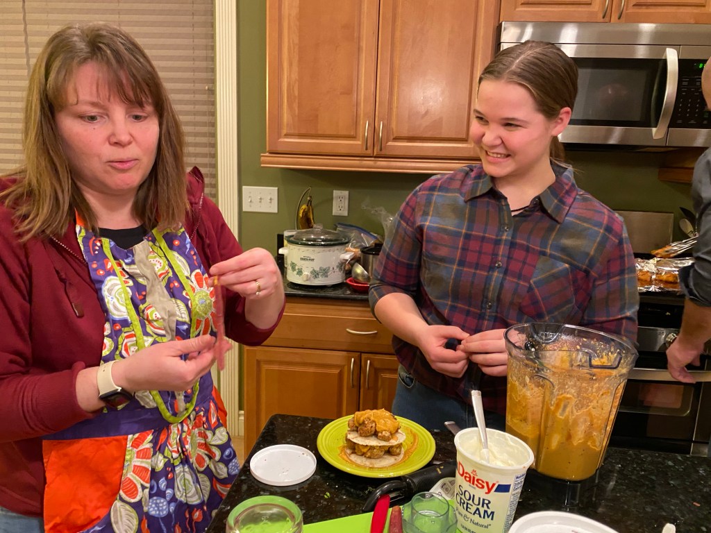It’s no surprise that this duo gets props for their creativity: they made a Shake-N-Bake Birthday Cake! It’s pork loin nuggets, dipped in an egg wash and breaded with crumbled potato chips and bread crumbs. They were air fried to perfection, and then layered on flat bread and drizzled with a “frosting” of puréed carrots and harissa sauce. First taste of the sauce was apparently not great, but they added chicken stock, garlic salt, lime, sour cream, and who knows what else to turn it around before time expired! The decorative spirals on the “cake” were created with carrot peelings – a definite nice touch!