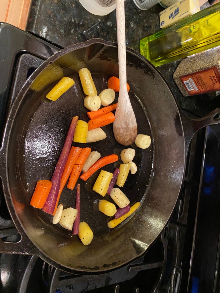 We all knew Keri and Maggie would be a tough team to beat, and they did indeed prove up to the challenge. Team 2 selected the bag of ingredients that Nancy and Sam assembled, and opened it to find pork loin chops, multi-colored carrots, and potato chips. They also had to use the harissa paste, which I knew would be a challenge because Maggie does not like spice!