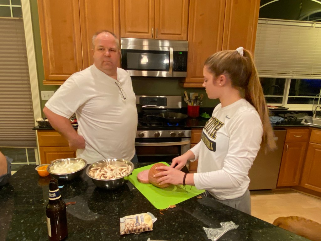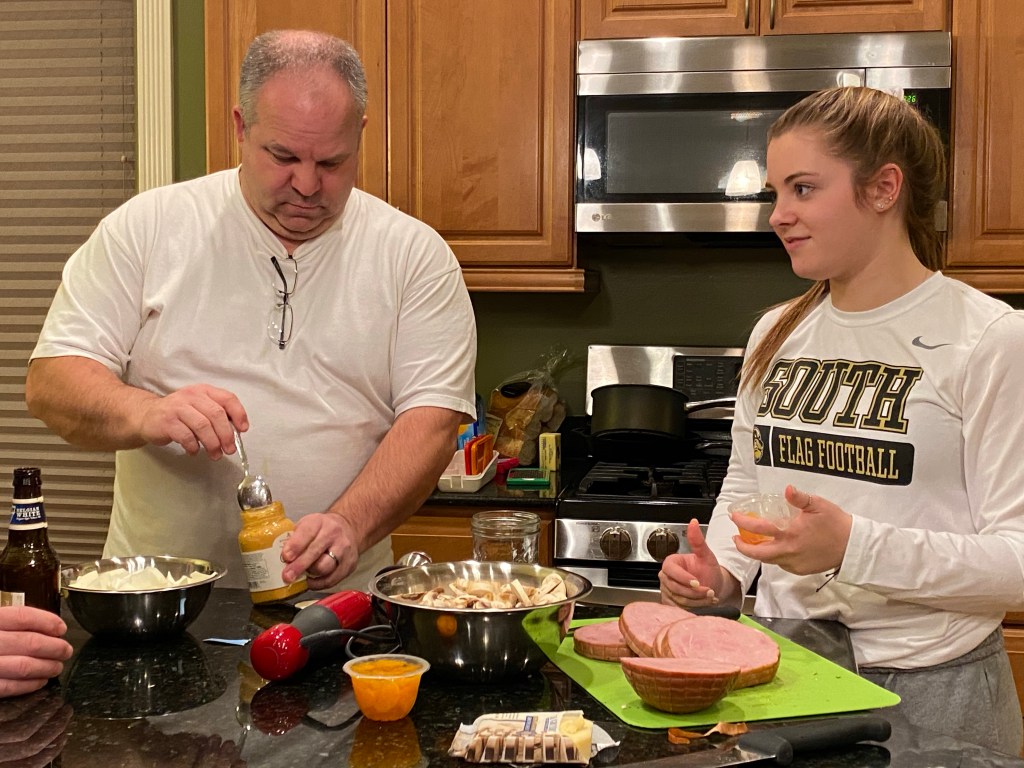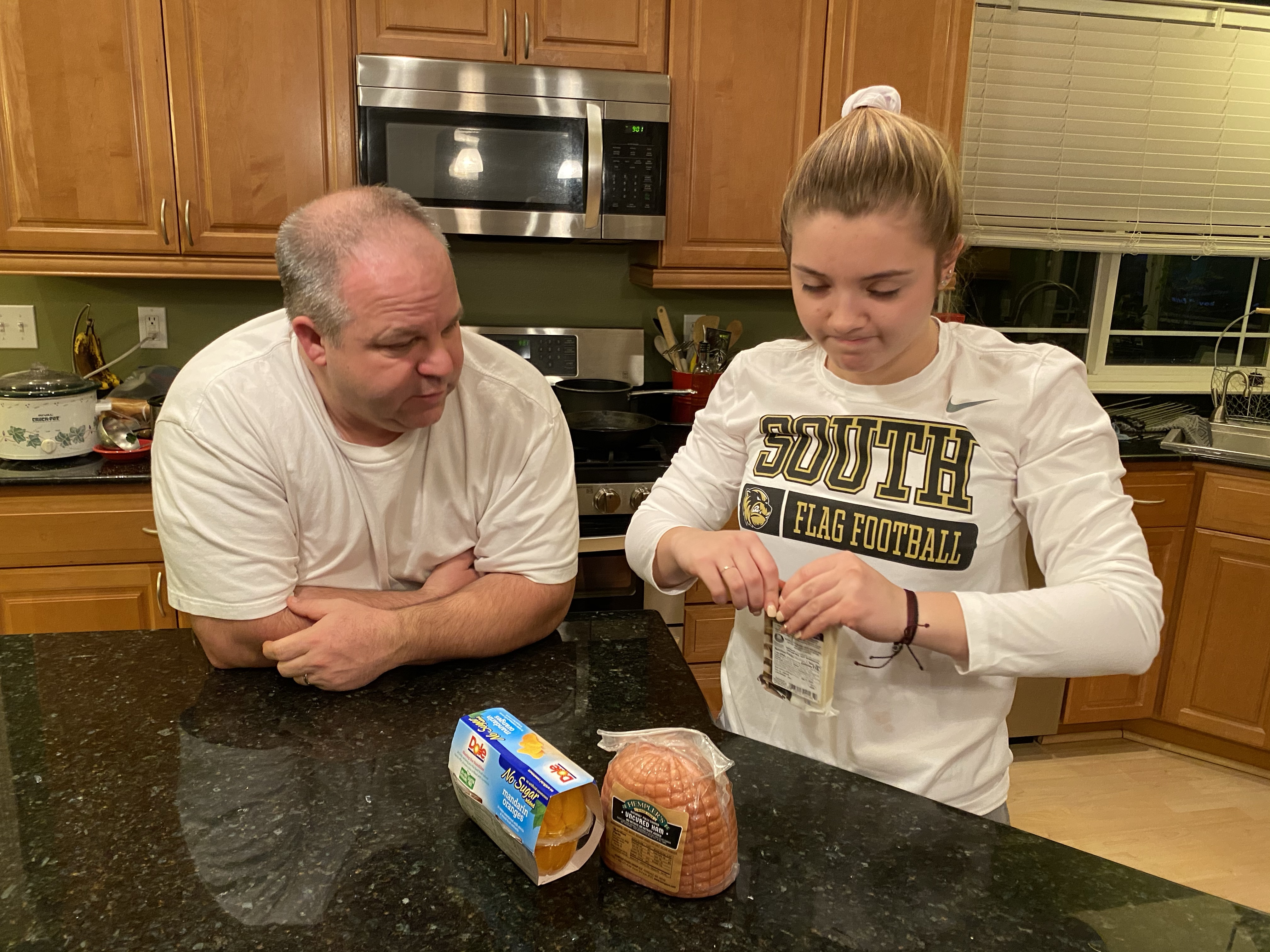 Clark and Emily’s basket was courtesy Keri and Maggie. Team 4 was gifted a fully cooked ham, mandarin orange cups, and Gruyere cheese. Of course, they also needed to use my Chipotle Aioli.