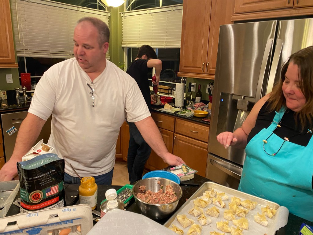 Nancy and Sam’s bag was put together by Brandon and Lia. Team 3 got ground pork, square dumpling wrappers, and Chardonnay BellaVitano cheese. This round my mystery ingredient was Chipotle Aioli. Sam gave the Aioli a sample and…. let’s just say he was not a fan! Even so, he managed to make an edible non-traditional dipping sauce for their dumplings, along with a delicious traditional one: