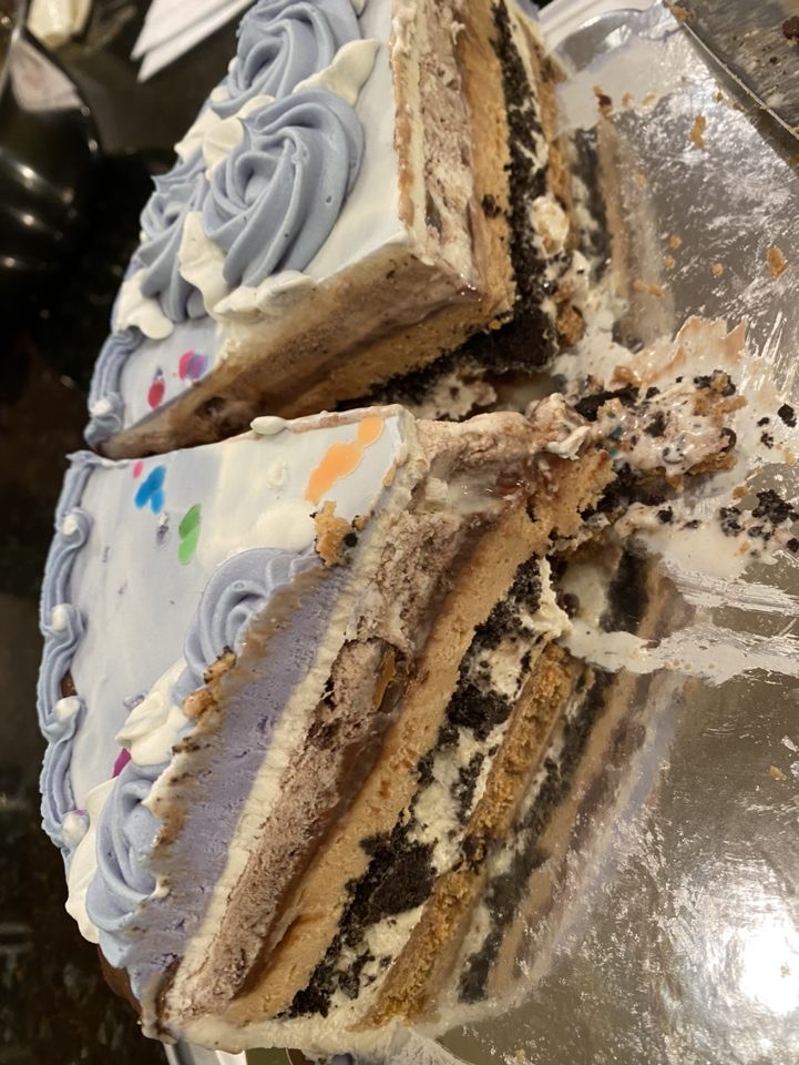 Team 2’s creative “cake” with perfectly cooked pork (which is not easy!) was impressive. And to top it off, later that night Keri surprised me a real cake for dessert. It’s a good thing we didn’t have a dessert round, because this ice cream cake would have blown away every bit of the competition! Look at all those layers!