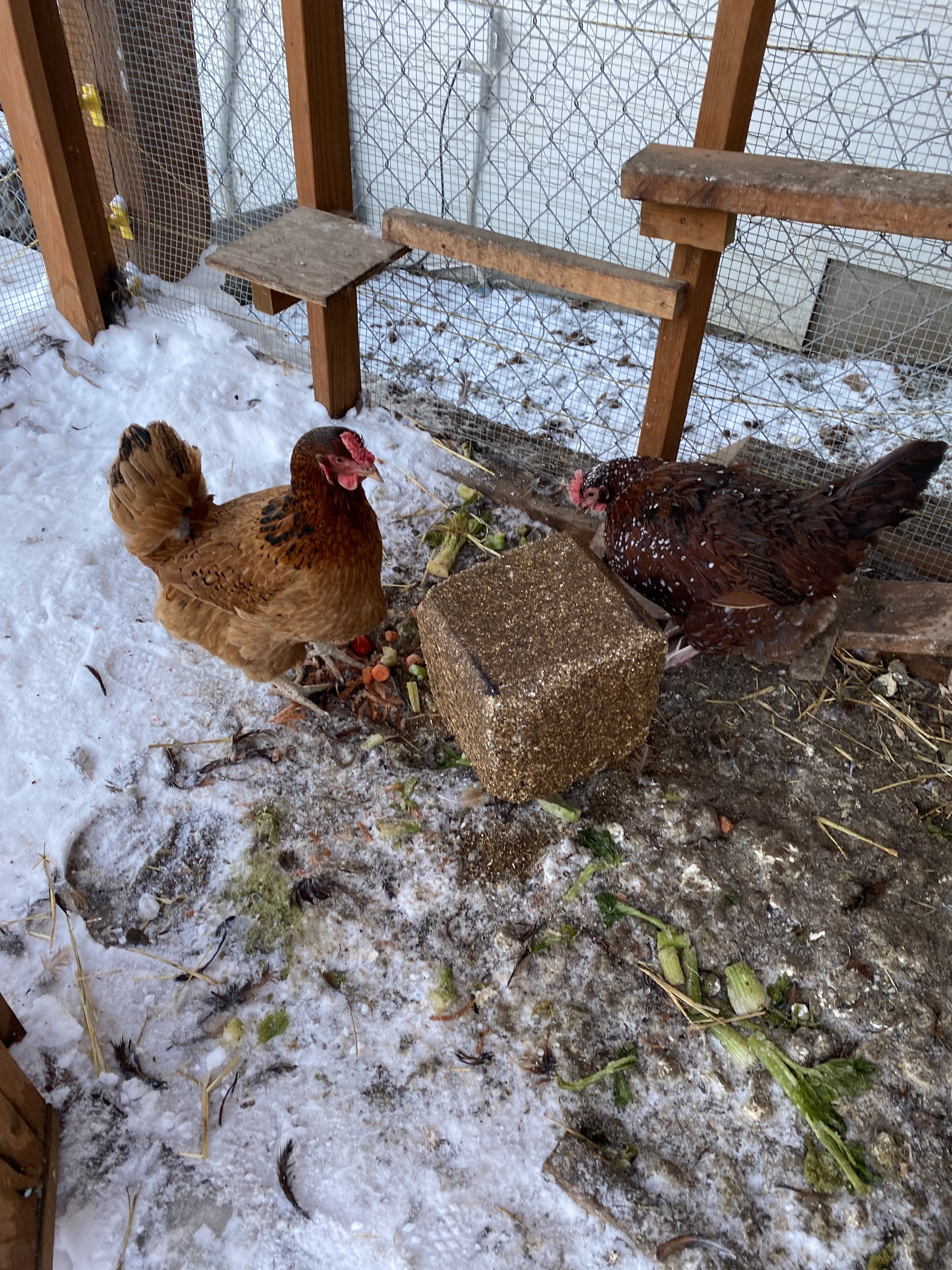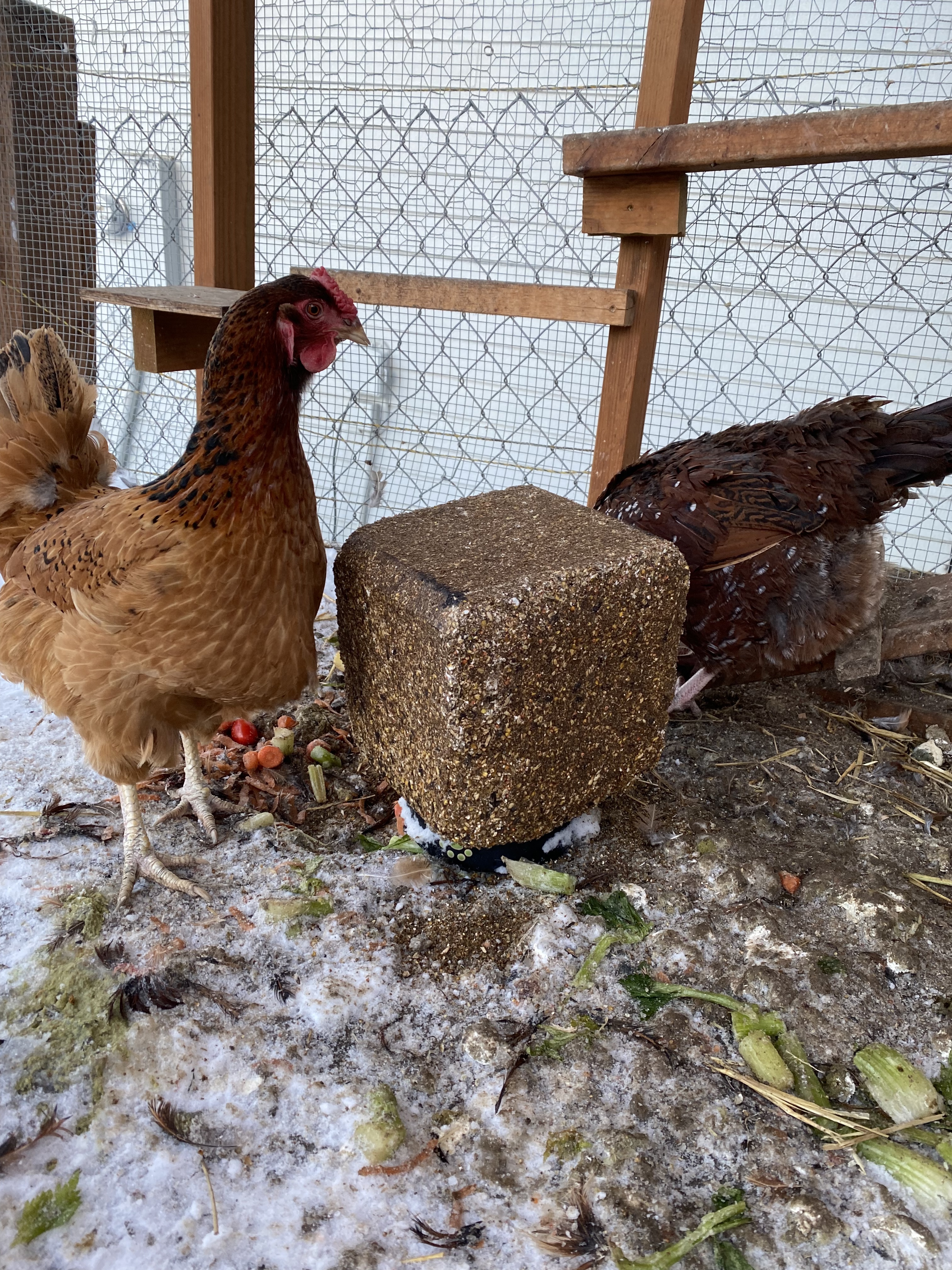 We had planned to give the chickens a flock block for Christmas, but we put it in the coop later that day. We decided a better holiday gift will be bars on their window screen!
