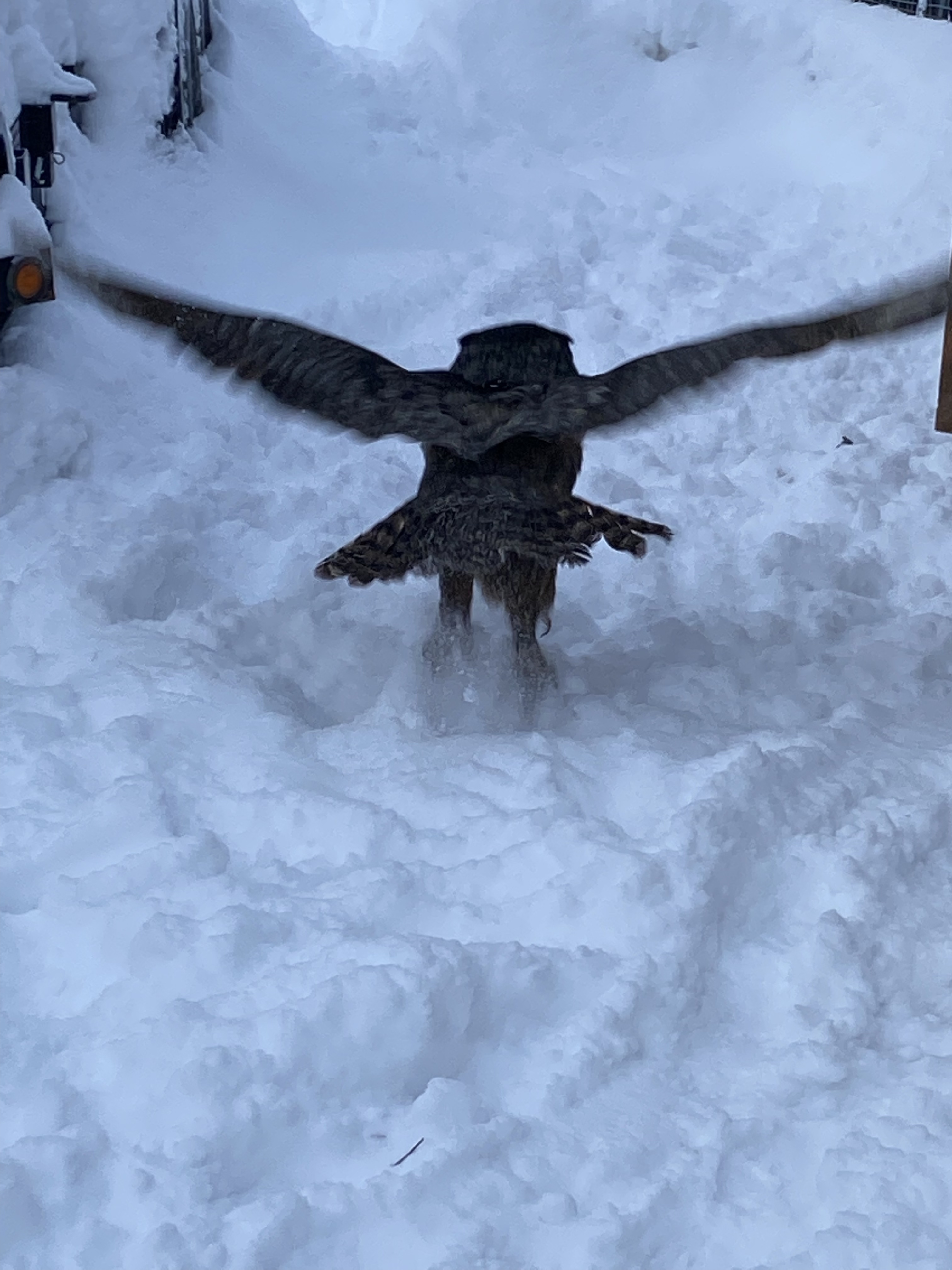 She tried to shoo the owl out of the coop, but the confused bird wouldn’t leave the corner. Fortunately Clark hadn’t left for work yet, and he ran out to assist.