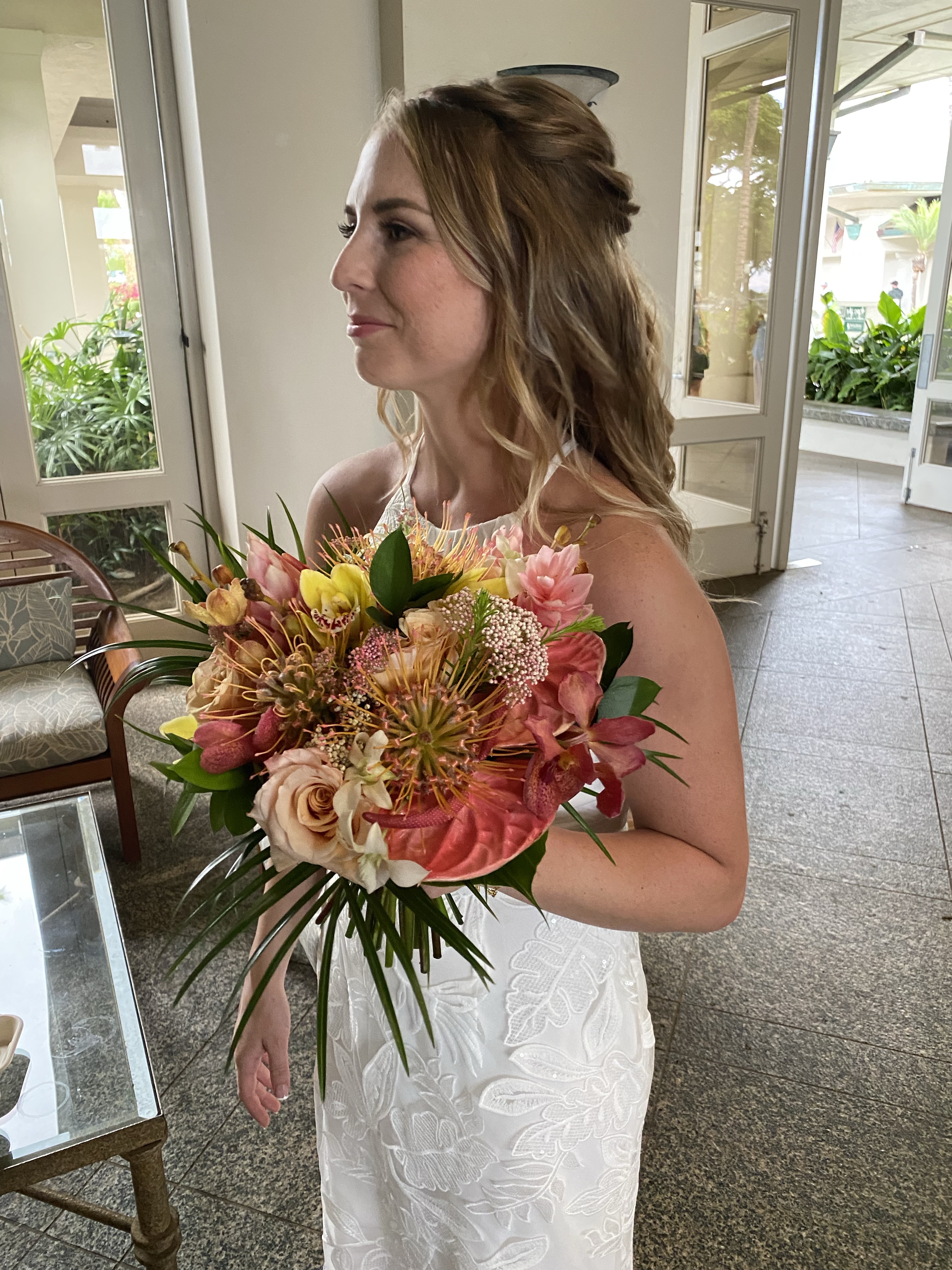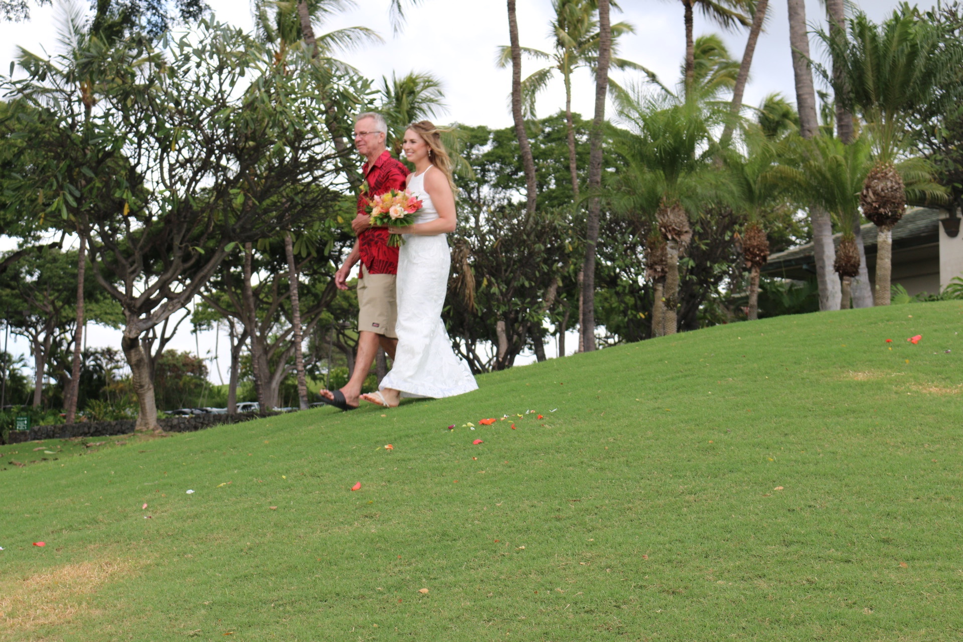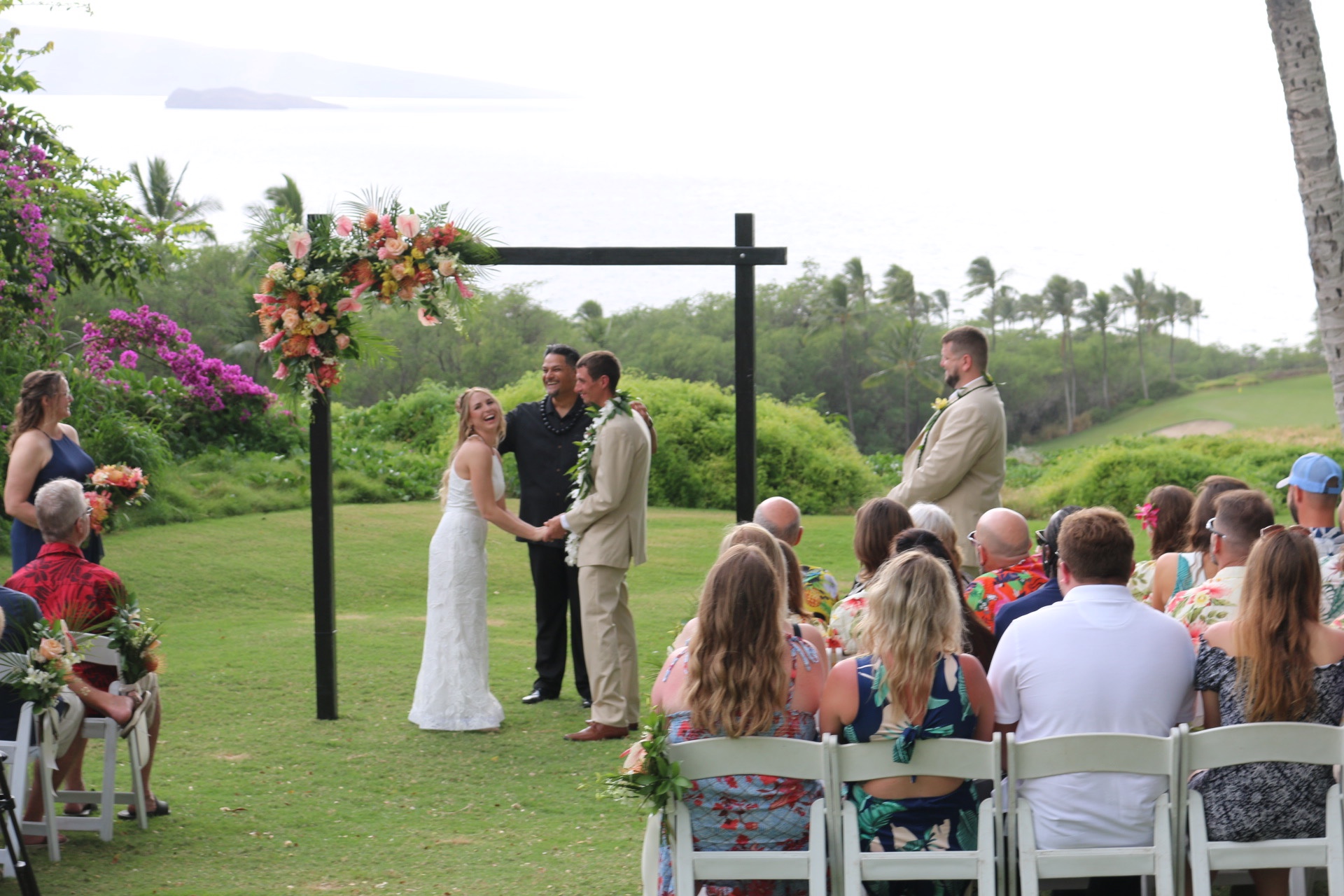 The ceremony was idyllic. We gathered on the edge of a golf course that overlooked the Pacific Ocean, surrounded by palm trees and flowers. There was ukulele music and all the positive energy that comes from the blowing of a conch shell.