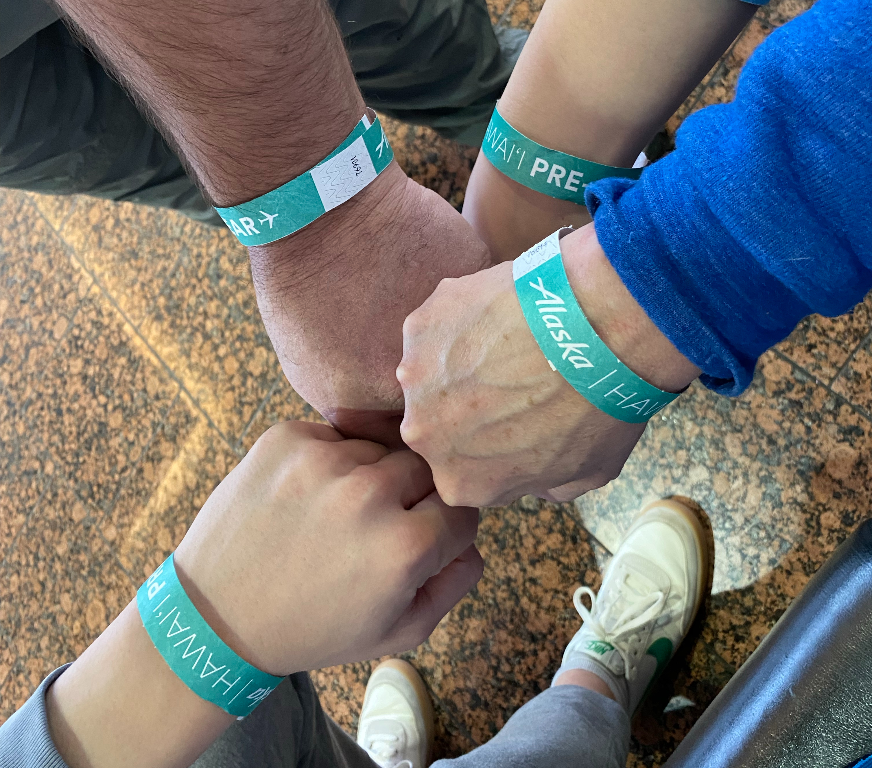 Getting there wasn’t completely without stress. Hawaii still had the strictest Covid restrictions in the nation, and even vaccinated visitors needed to jump through quite a few ever-changing hoops before boarding the plane. We breathed a sigh of relief when we were granted the coveted wristbands, which meant we had successfully met the requirements before boarding the plane.