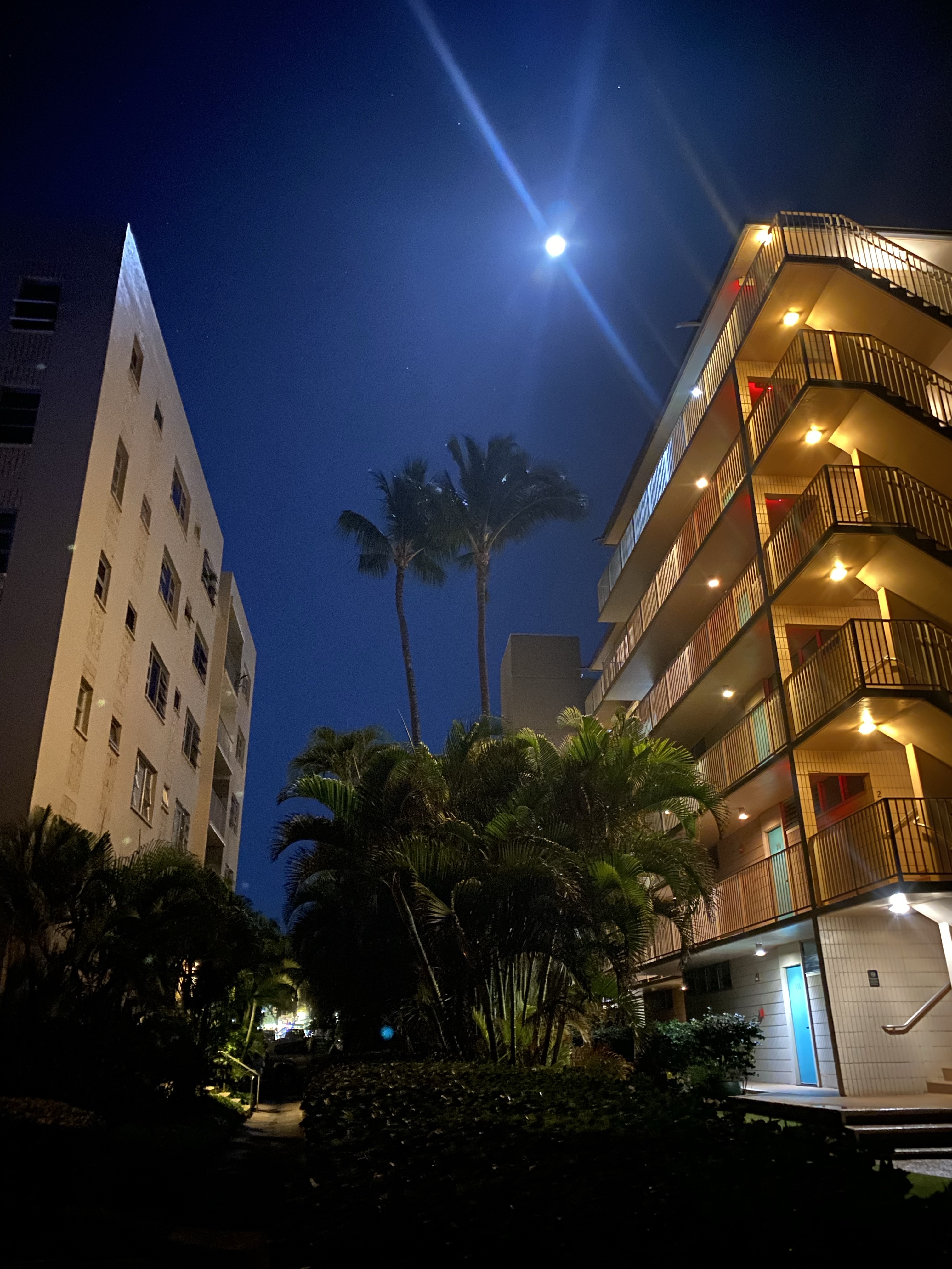 There was no need, since my brother had stocked the fridge in our rental unit with pizza and beverages. We quietly dropped our bags and grabbed a slice of pie before rushing out for a moonlit stroll along Kamaole Beach II.