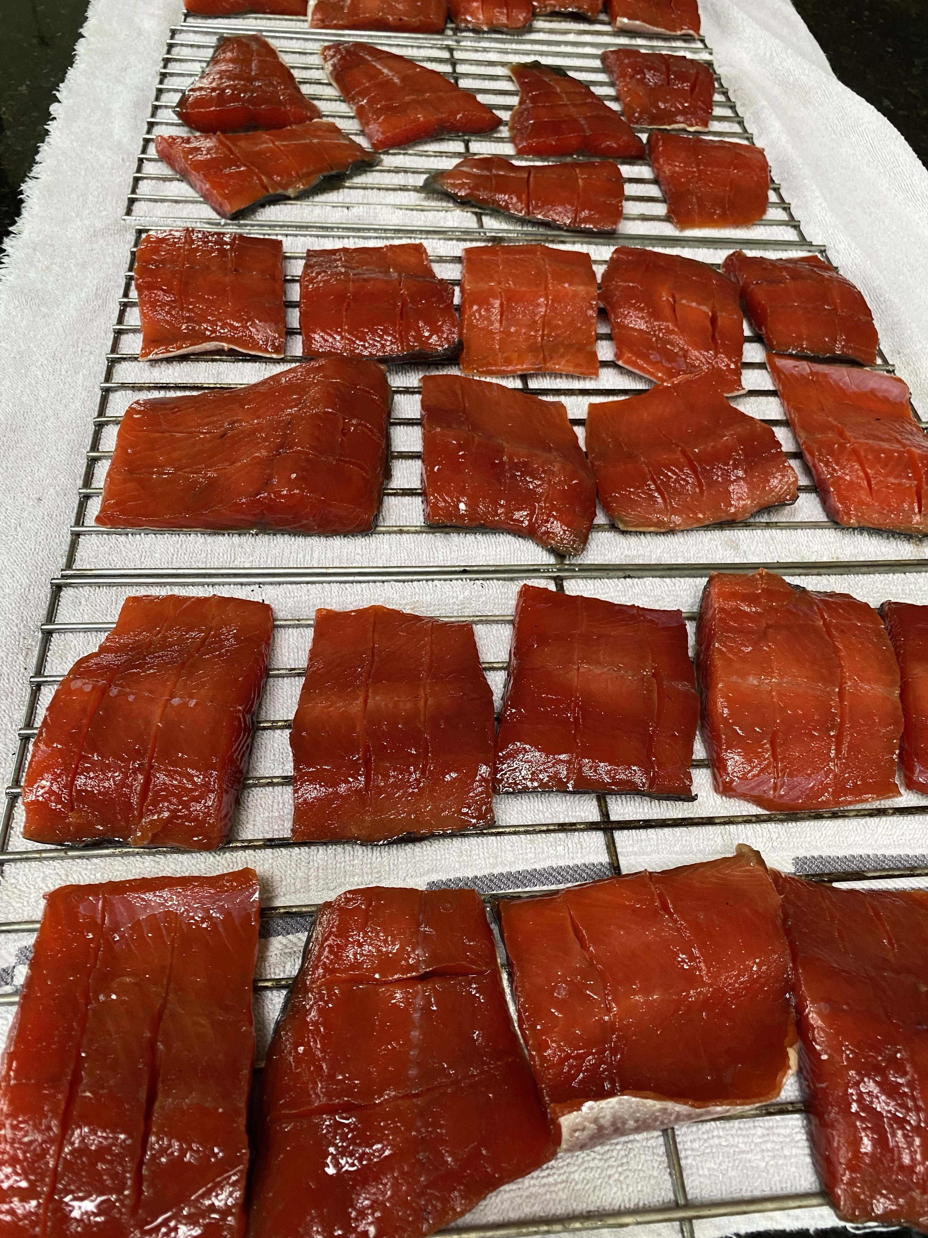 I always dry the fish directly on our smoker’s racks, but it will go faster if you keep them in a single layer rather than stacked, otherwise the top layers will drip onto the fish below. (I don’t have a photo, but it works best to elevate the racks on cookie sheets while they dry, and that’s how I always do it now.)