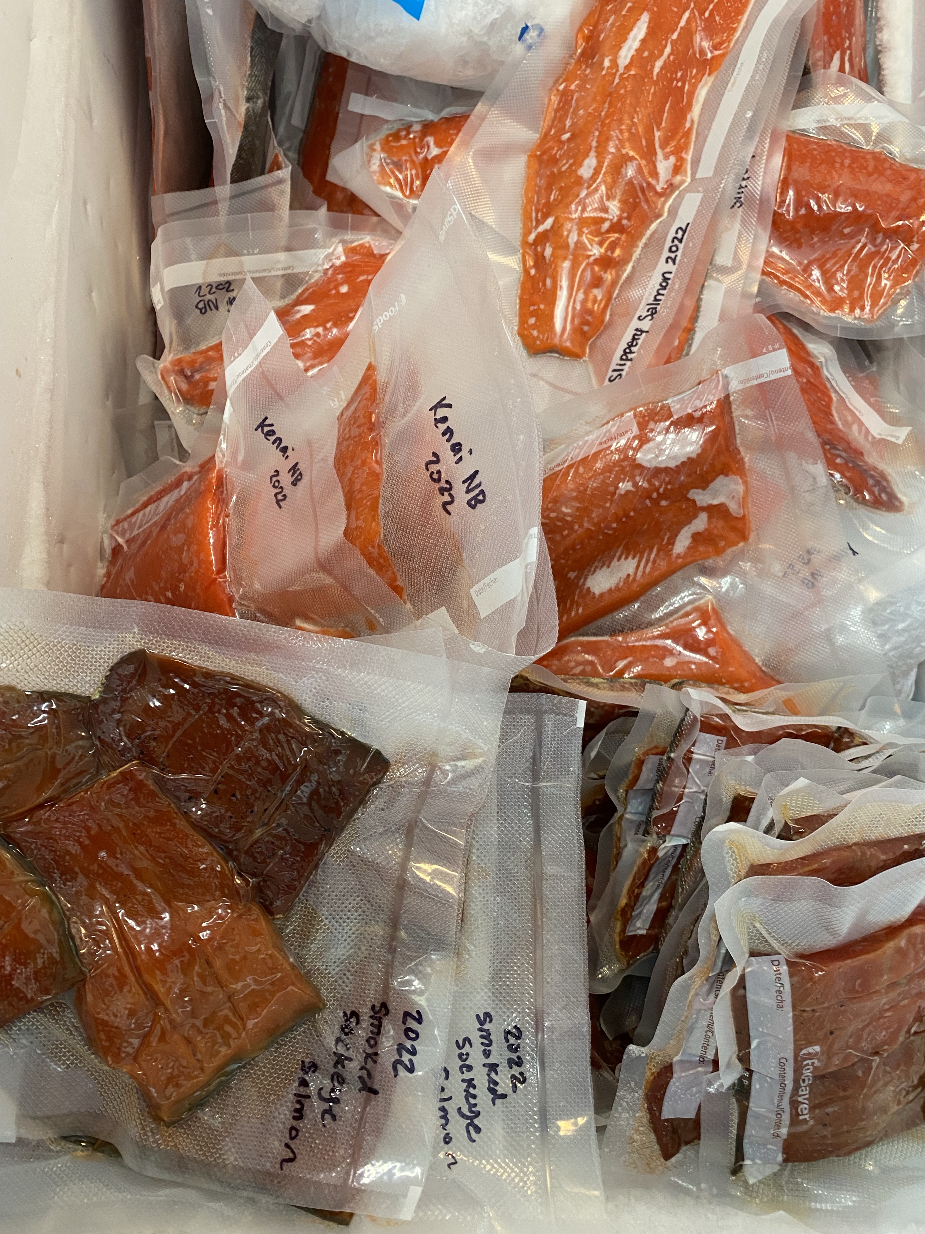 Obviously fish vary in size, but I’d say our filets average just over a pound each. Five salmon (10 filets / 12ish lbs) typically fill the racks of our Big Chief smoker.