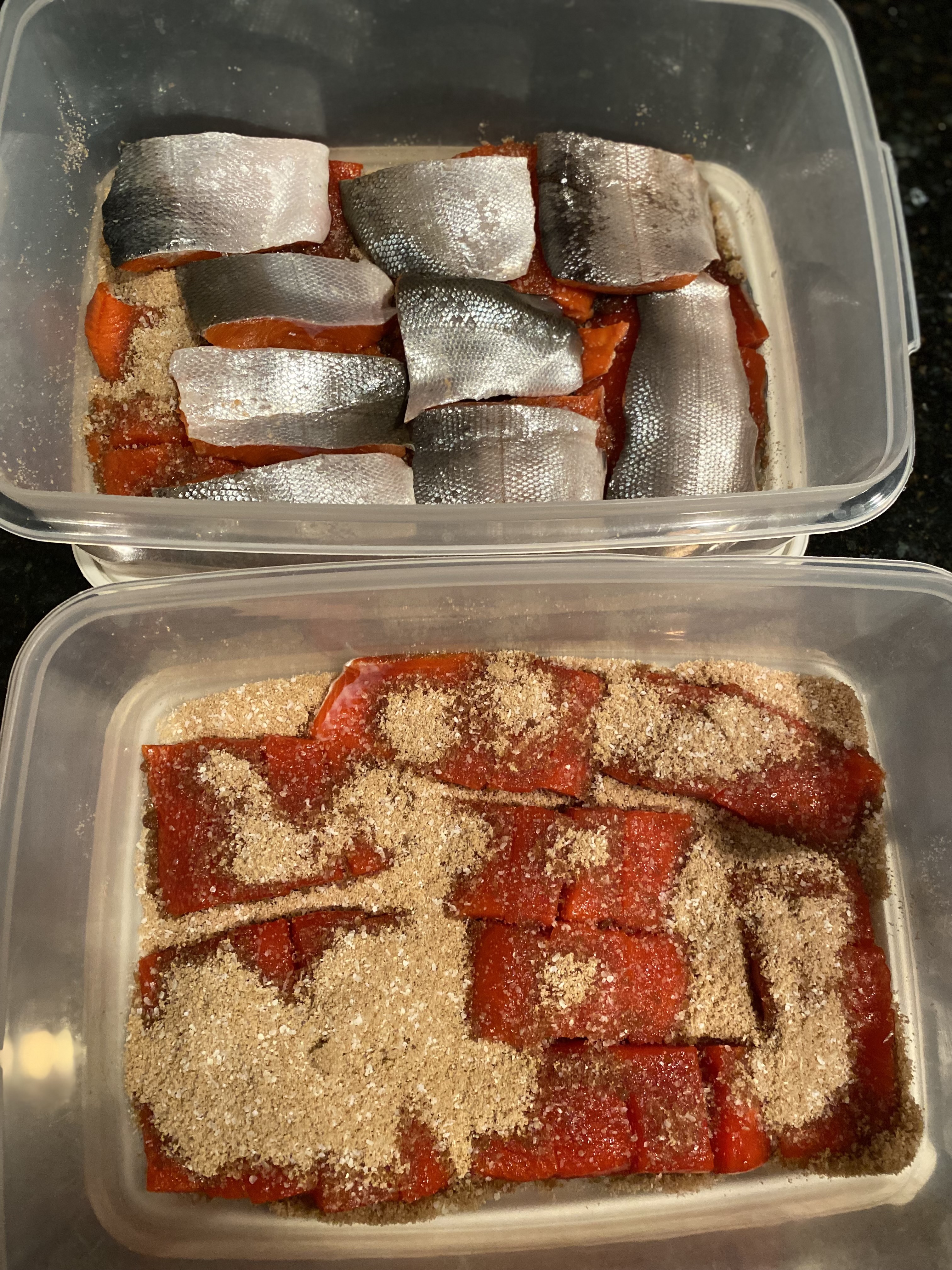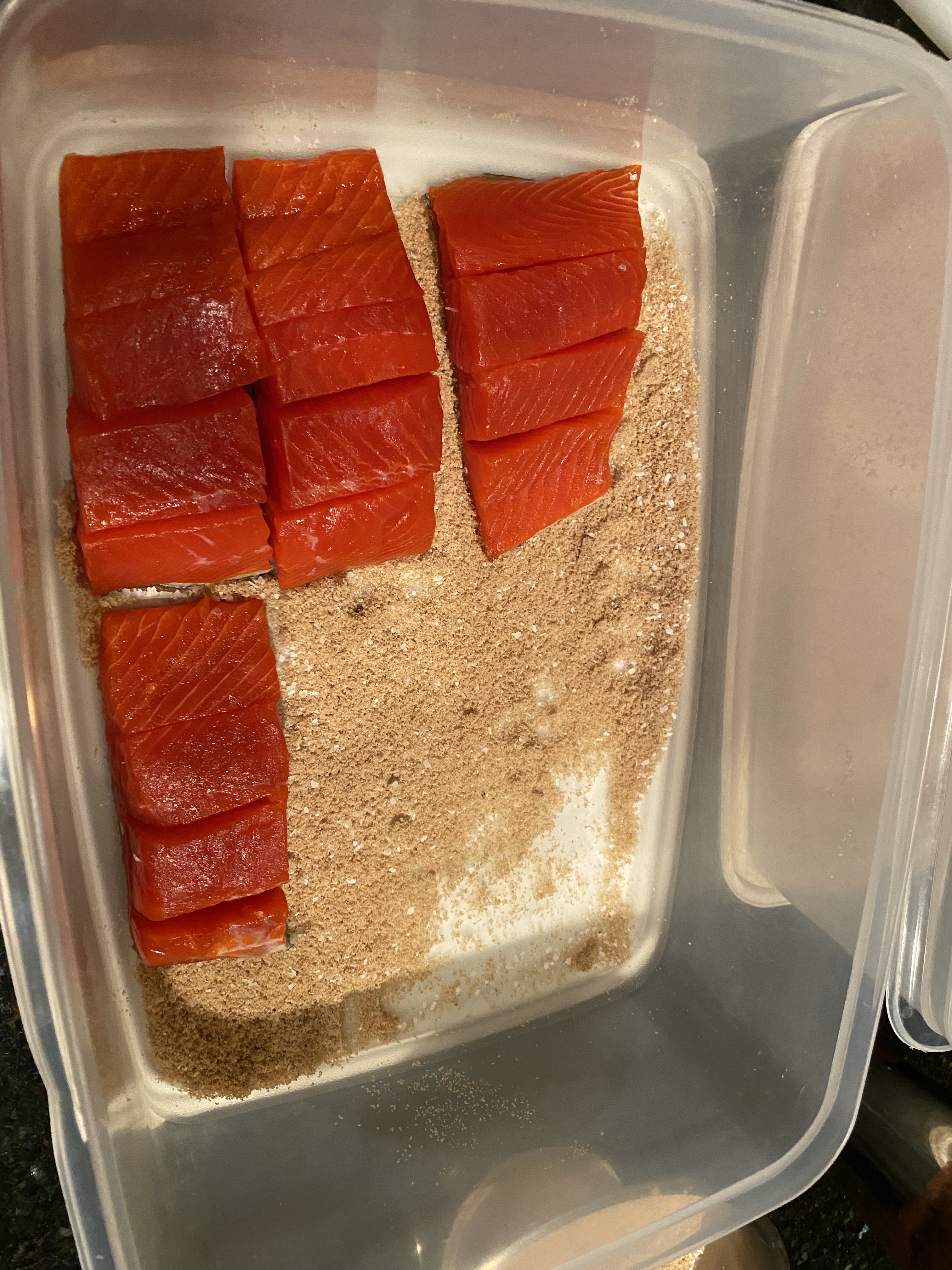 I brine the fish in two large plastic Rubbermaid containers (they hold 33 cups and are approximately 14 x 10 x 5 inches). Place a light layer of the sugar/salt mixture in bottom of your container. Place one layer of salmon skin side down, and cover with more of sugar/salt mixture. Put next layer of fish flesh side down, and continue layering fish flesh-to-flesh and skin-to-skin. All fish should be completely covered with the sugar/salt mixture. Cover and refrigerate 12 – 24 hours.