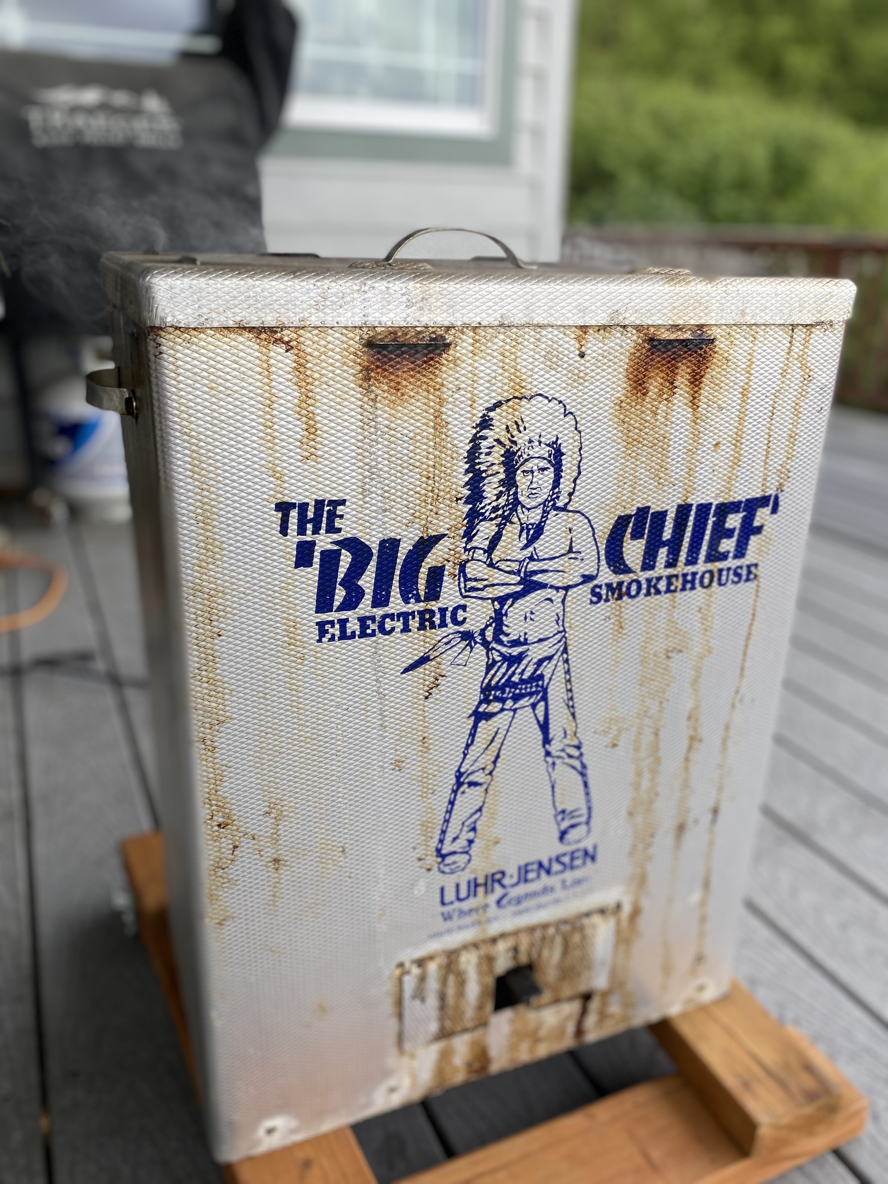 We own a nice Traeger grill, but for smoking salmon we always use our 20 year old Big Chief Electric smoker because of its extremely low heat. We elevate our smoker with pieces of wood to protect our decking.