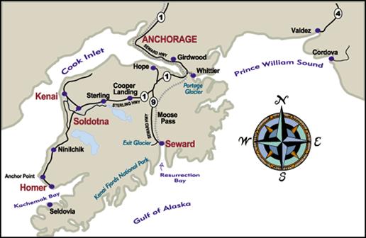 - 3 hours south of Anchorage: Soldotna. Kenai River fishing mecca.